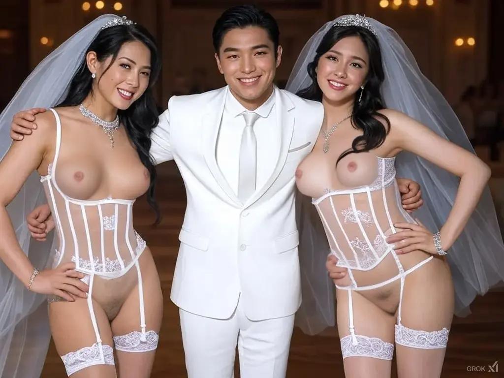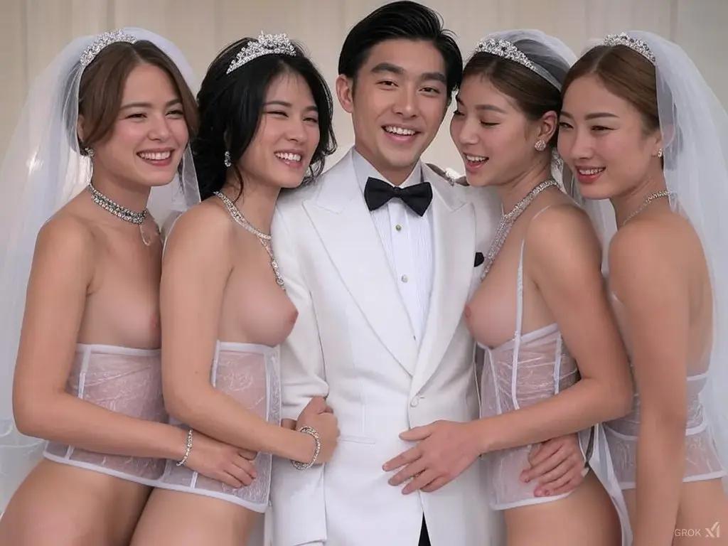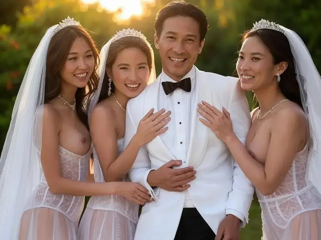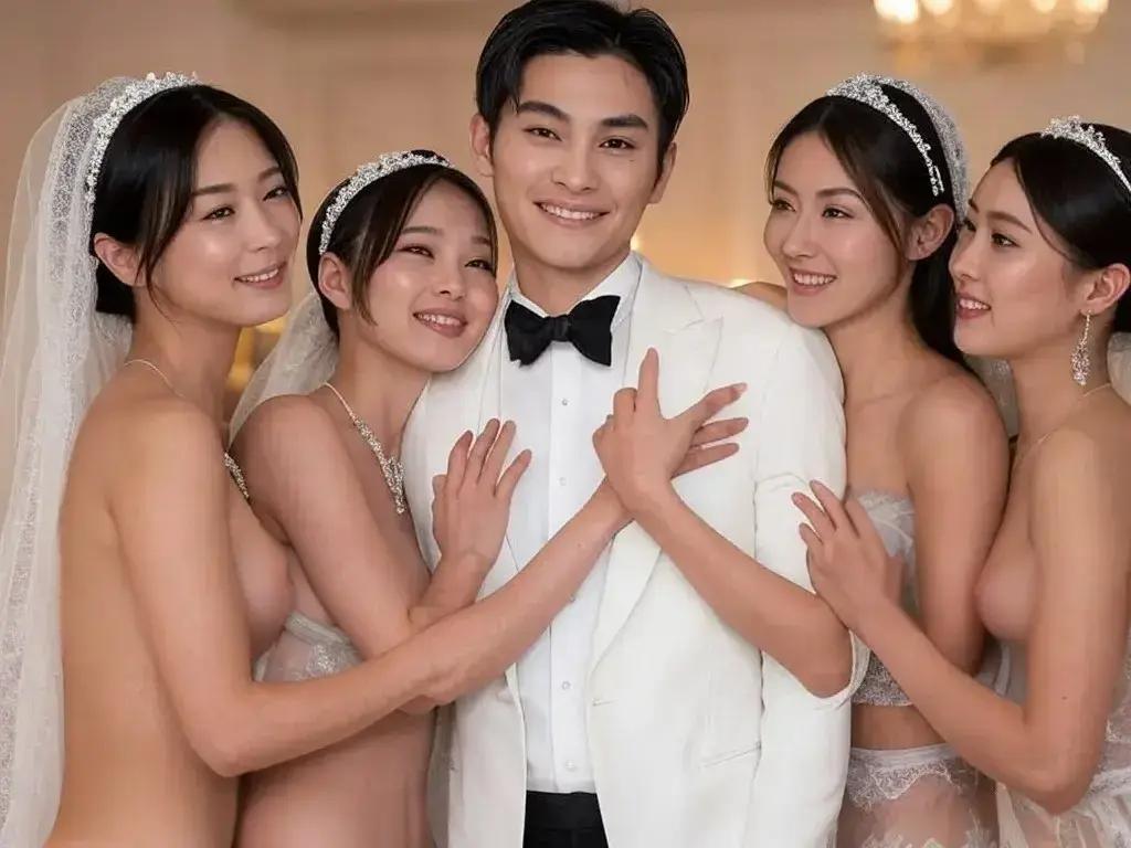 一夫多妻婚であることから別名「複婚式」とも呼ばれる結婚式のあと、新婚初夜を前に、積極的に1人の新郎に抱きつく複数の新婦たち。