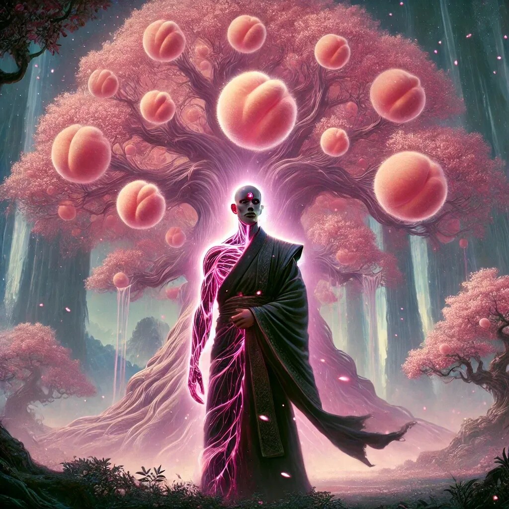 まるで桃の世界樹の守護者のような存在感があります。🍑🧘♂️🌳🌸