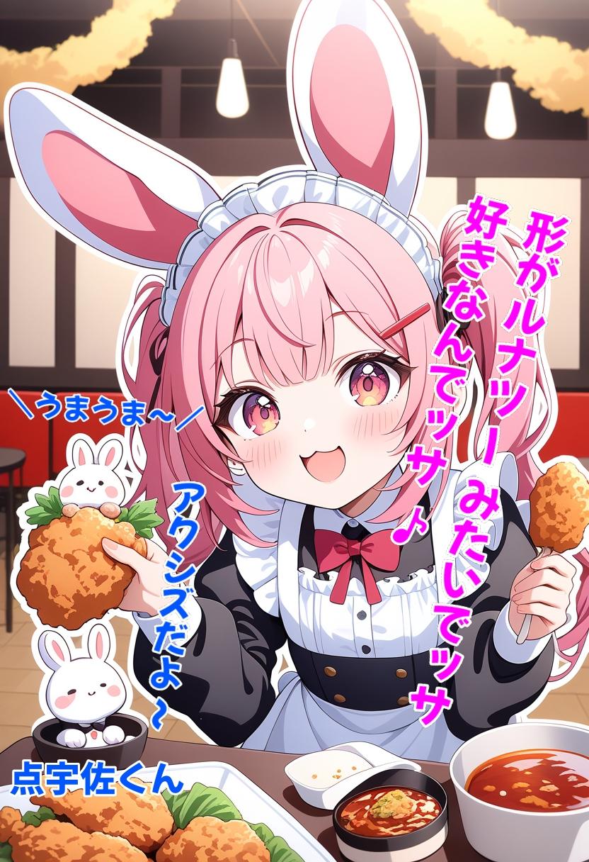 起源は宇佐からあげの日から来ていて、彼女の祖先である兎小屋の兎たちは、美味しそうに唐揚げを食べる子供たちの姿を見て、唐揚げを作りたい、唐揚げ食べたいとなって、兎耳となった。