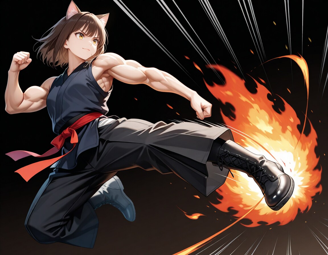 ↑こちらの、OkazuSystemObjectさんのメイドさんによる、華麗なる足技に触発されまして、猫拳法の達人なるいつもの猫娘さんに、足技を披露して貰いました。