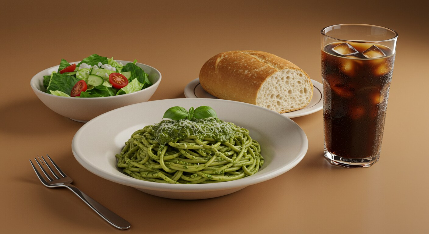 内容は、ジェノベーゼ、サラダ、パン、アイス珈琲で御座います。