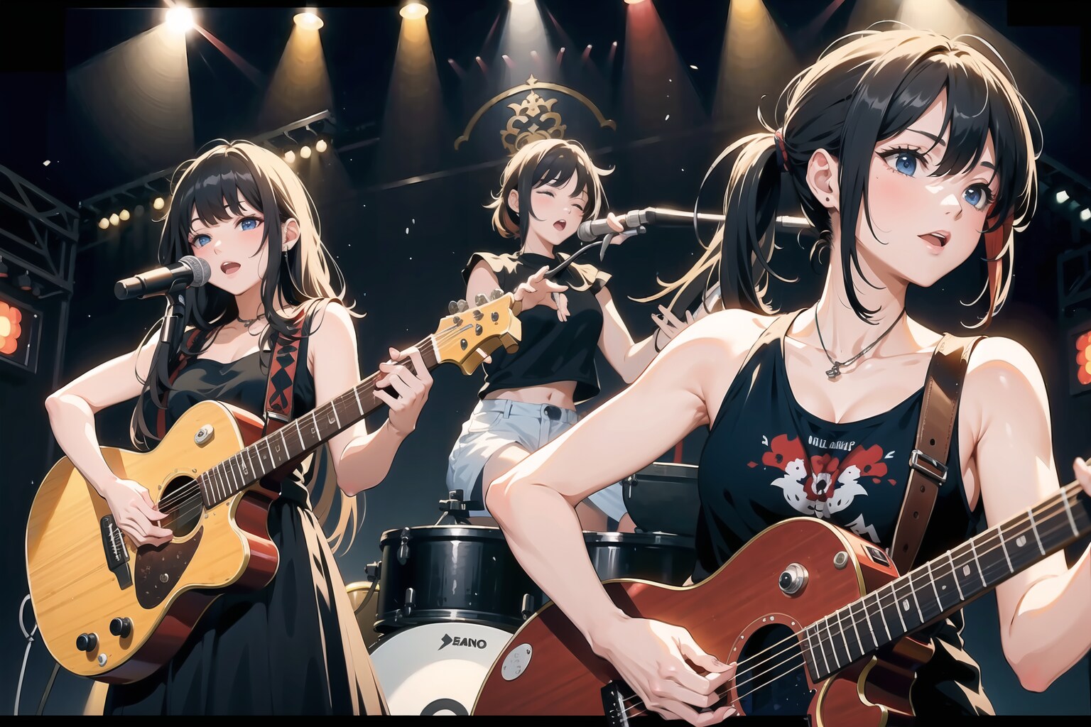 Steps: 40, Sampler: DPM++ 2M SDE Karras, CFG scale: 8, Seed: 452240630, Size: 768x512, Model hash: 364a13041d, Model: BreakDomain_breakdomain_M2150, Variation seed: 392736542, Variation seed strength: 0.05, Denoising strength: 0.4, Tiled Diffusion: {"Method": "MultiDiffusion", "Latent tile width": 96, "Latent tile height": 96, "Overlap": 48, "Tile batch size": 1, "Region control": {"Region 1": {"enable": true, "x": 0.5815, "y": 0.0, "w": 0.4185, "h": 1.0, "prompt": "1girl, solo, girl playing guitar, sweating, looking at her right hand, upper body, rock band, long hair, low ponytail, ", "neg_prompt": "(horse:1.5)", "blend_mode": "Foreground", "feather_ratio": 0.2, "seed": 2480046524}, "Region 2": {"enable": true, "x": 0, "y": 0.1647, "w": 0.3641, "h": 0.8353, "prompt": "1girl, solo, singing, mike stand, holding make stand with both hands, shouting, cowboy shot, rock band, long hair, bangs", "neg_prompt": "", "blend_mode": "Foreground", "feather_ratio": 0.2, "seed": 2075446783}, "Region 3": {"enable": true, "x": 0.2095, "y": 0.1731, "w": 0.5585, "h": 0.6714, "prompt": "1girl, (playing drums with sticks:1.3), (drums:1.2), rock band, (full body:1.3), cool, very short hair,", "neg_prompt": "", "blend_mode": "Background", "feather_ratio": 0.2, "seed": 3670575314}}}, Hires upscale: 2, Hires steps: 25, Hires upscaler: R-ESRGAN 4x+ Anime6B, Version: v1.3.2
