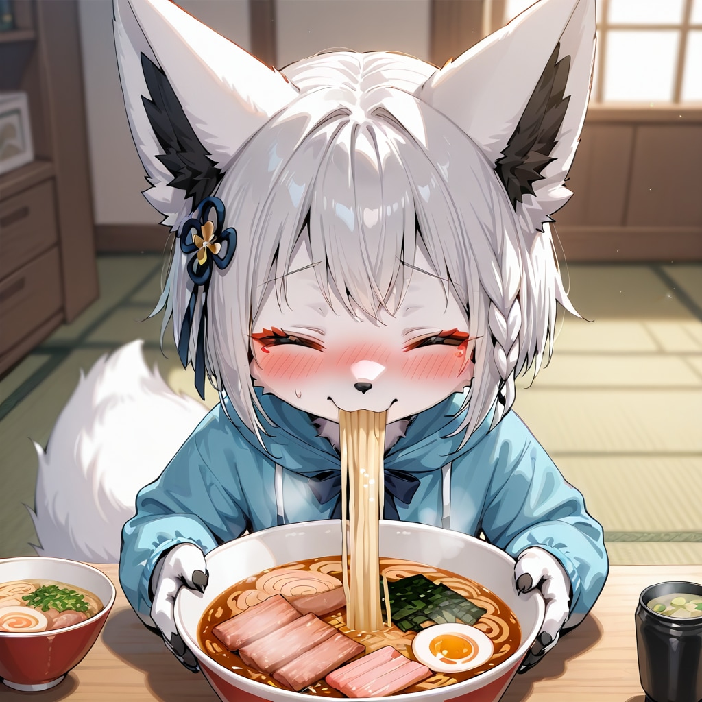 箸を使わないでラーメン食べてる化け狐ちゃん(箸つかってw)