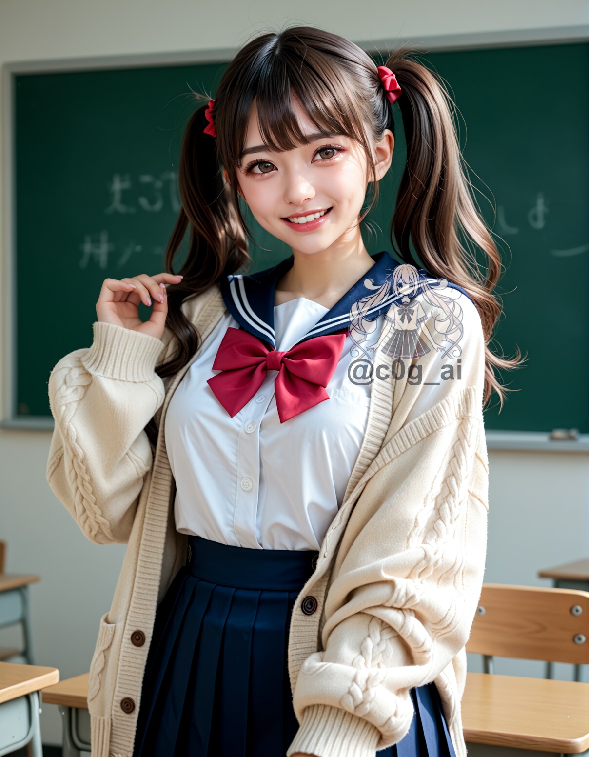 衣裳は、セーラー服+赤リボン+ベージュカーディガン+ミニスカート+黒スト+絶対領域となっています。
