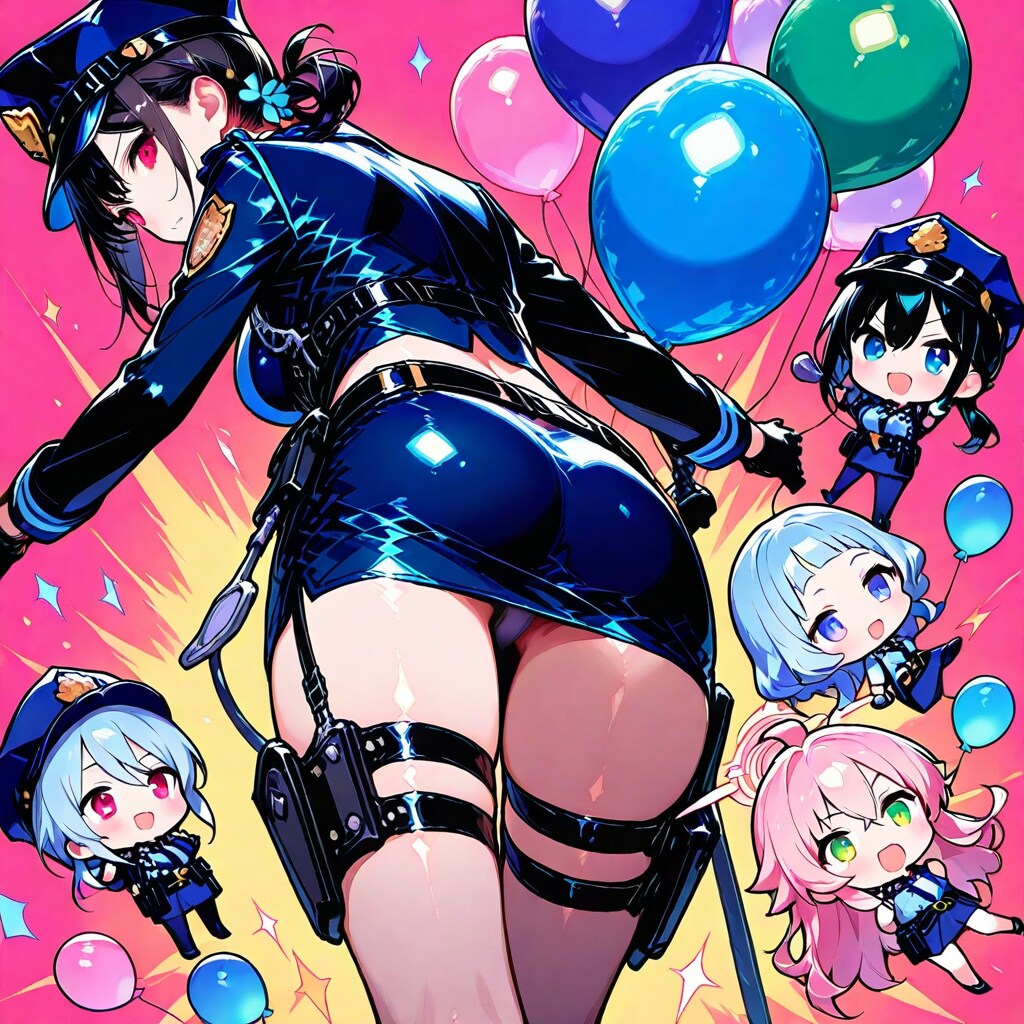 いっぱい風船を持つ黒髪お団子ヘアの警察官の美女。