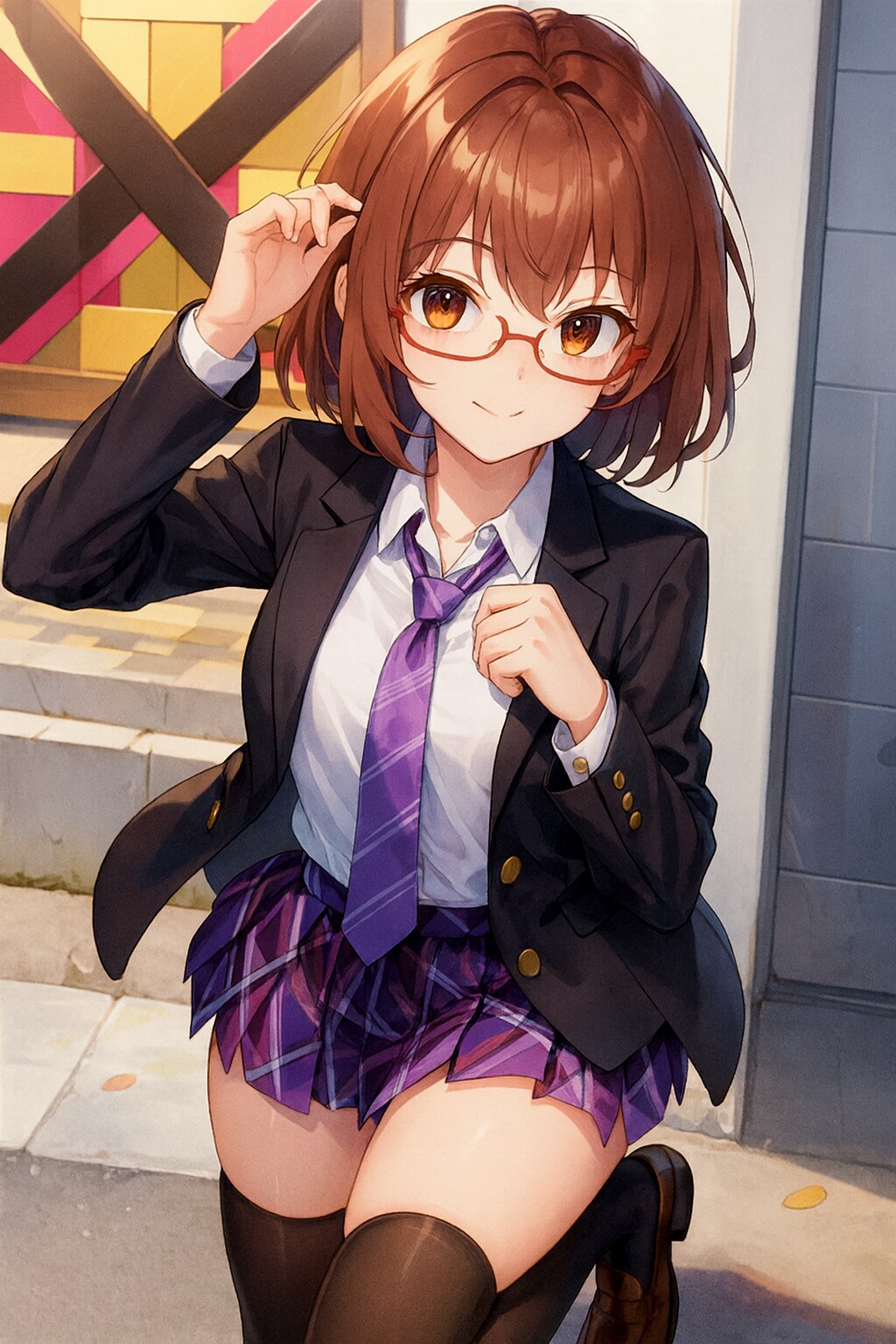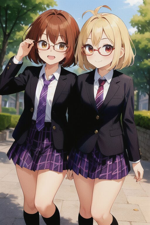 ピンク色のネクタイを指定したのですが、スカートの色に引っ張られて紫色になってしまいましたが、これもこれでいいかなと思い採用しました。3枚目は時々赤メガネをするうちの子のナツミ(黄色髪の子)と登校しているような感じにしました。