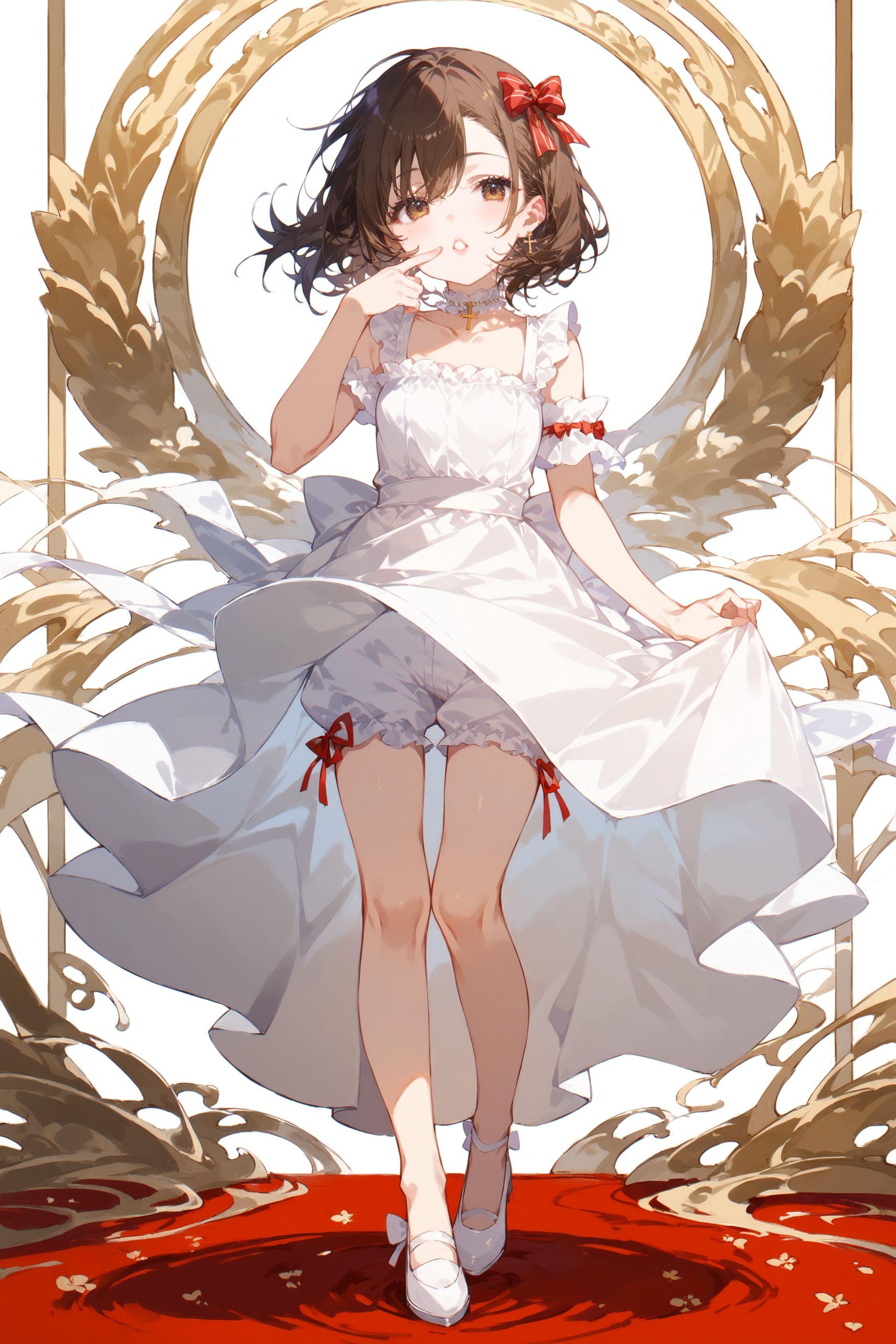 apron dressとbare sholdersでフリルのついた肩紐の白ワンピースがほぼ確定