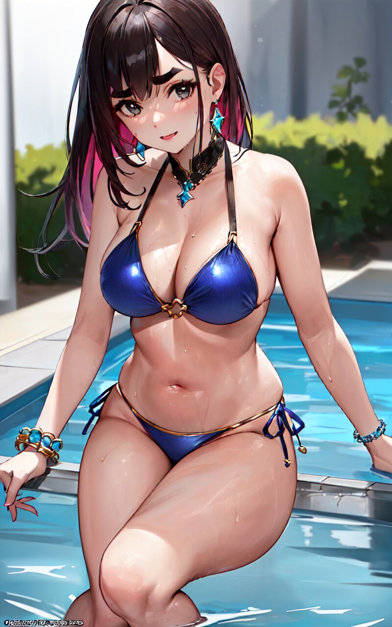 三枚目~四枚目は、上と同じプロンプトにちょっとだけ手を加えて、さらにギラギラさせたよ。まだ使いどころを研究中で、モデルによって使える場合と使えない場合がパキッと分かれるみたいだよ。