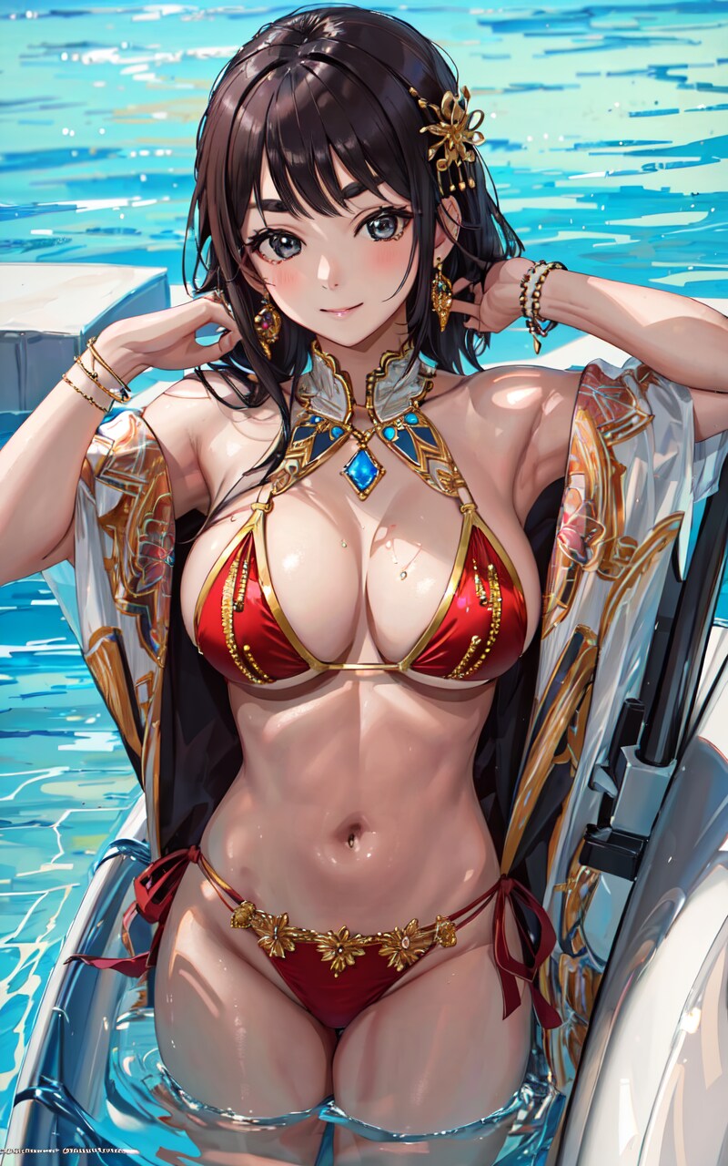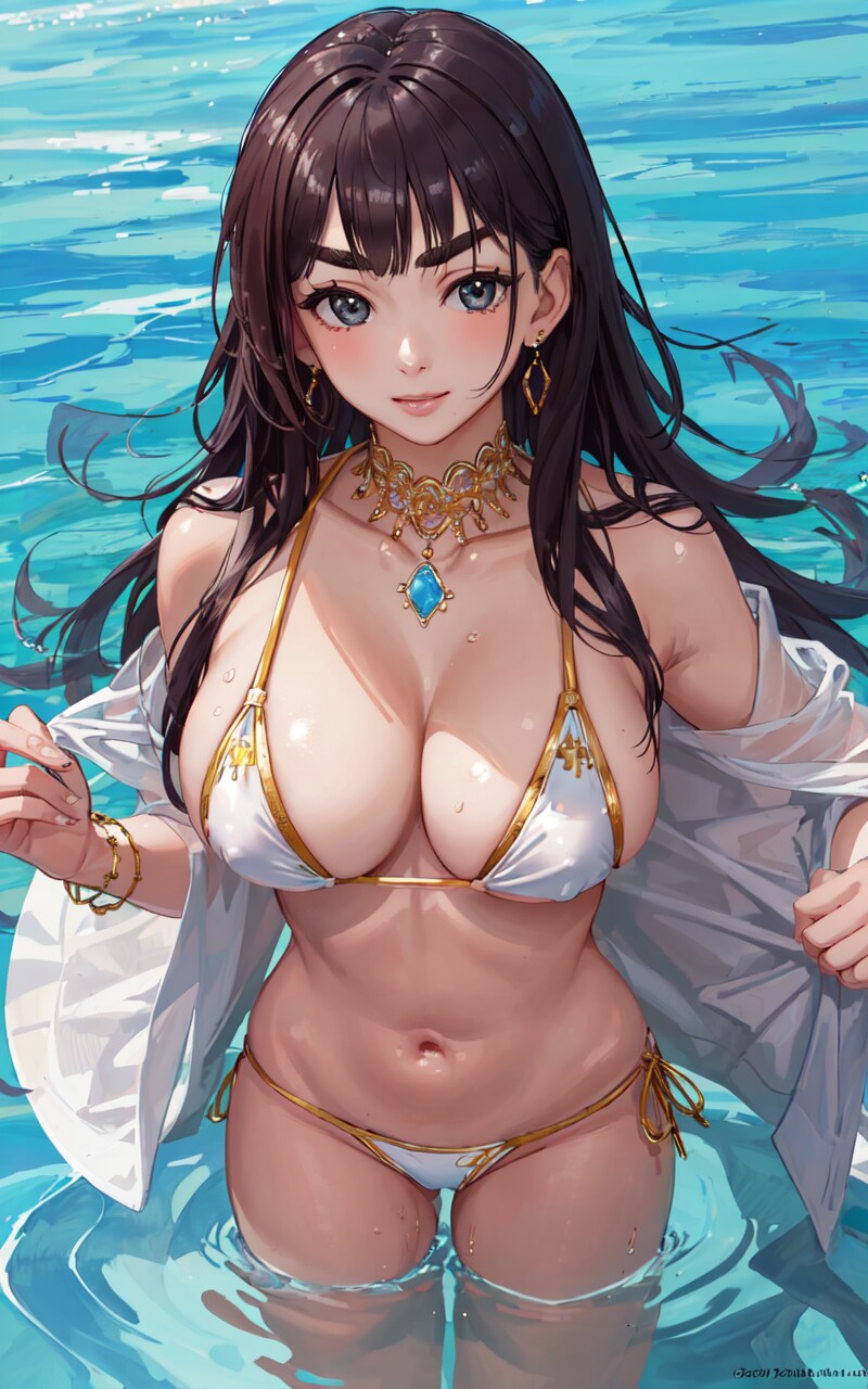 プロンプト表示にあるのは一枚目~二枚目のイラストを出力させた時のもので、"luxurious"や"jeweled"で修飾することでキラキラ感を出すことが出来るよ。ディティールの細かさが必要な場合、縦長構図なら最低800pxくらい解像度が欲しいよ。1000以上あるとだいたい細やかに描いてくれる印象だよ。