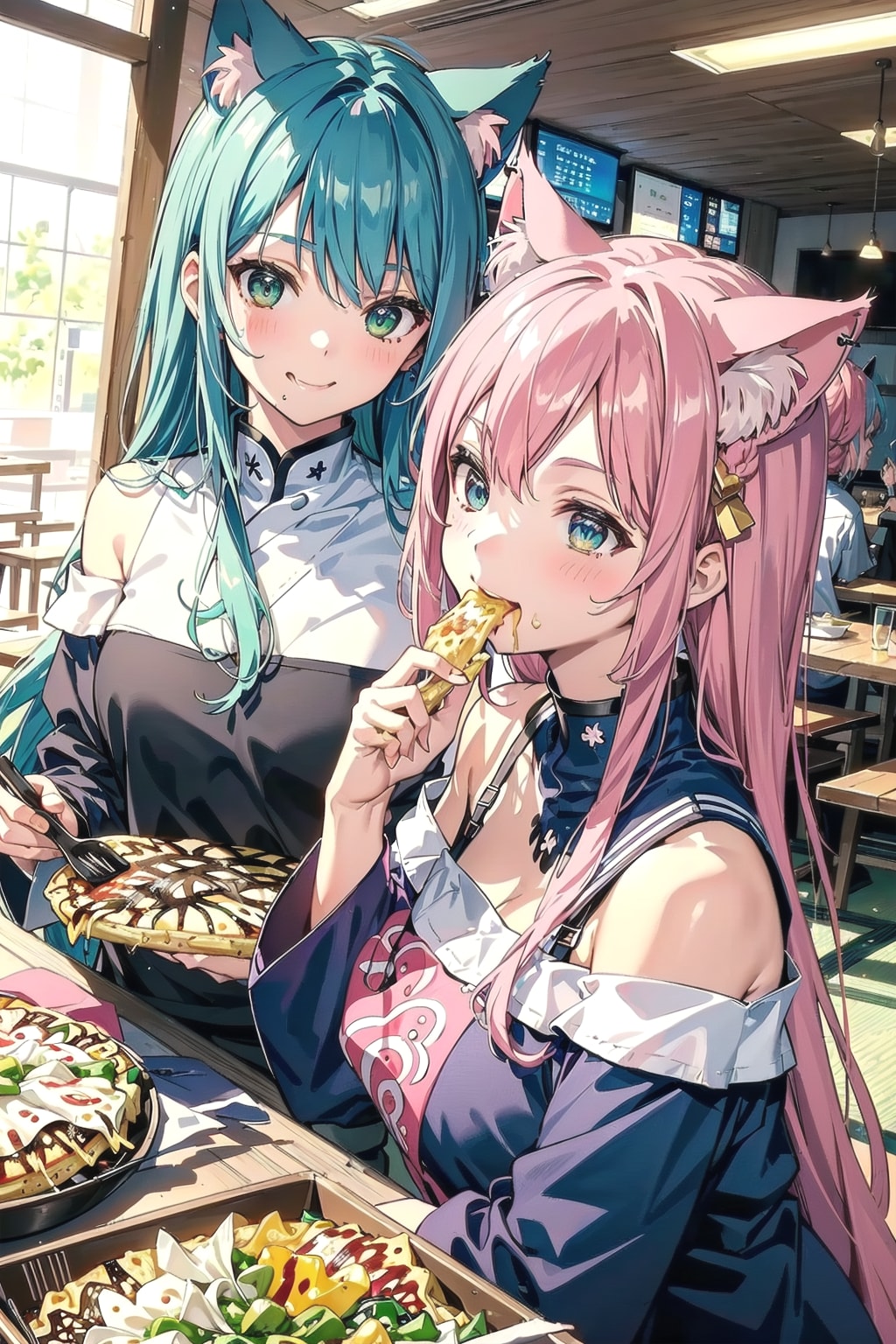 お好み焼きを食べる猫耳姉妹🐱🐱
