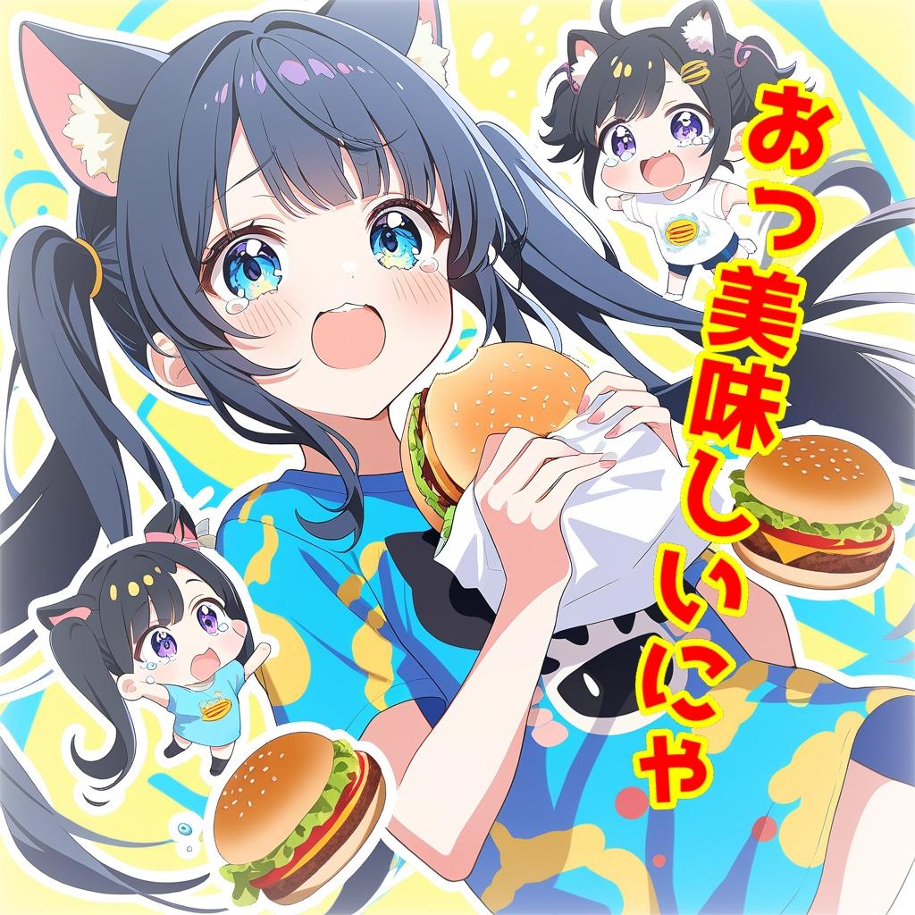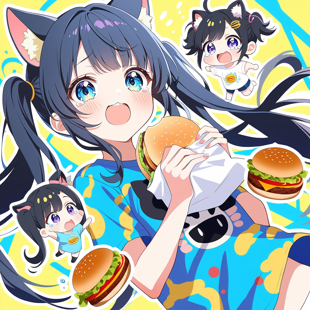 ちーちゃん,ちびキャラのみ,猫耳,チーズバーガー,ツインテール,黒髪,涙,t-shirts,笑顔,可愛い,