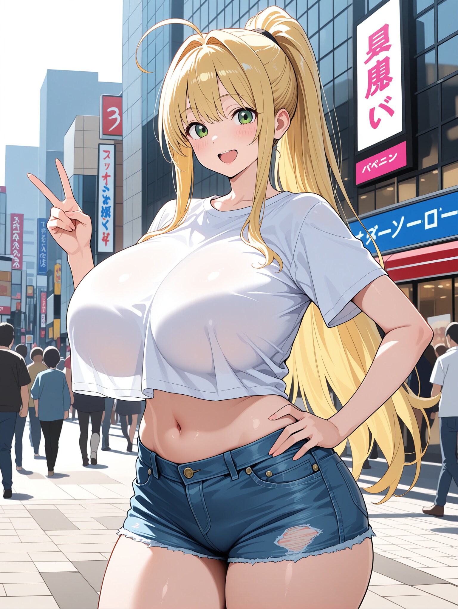 1 girl, curvy, blonde long hair, ahoge, high ponytail, hair intakes, long sidelocks, green eye, huge breasts,