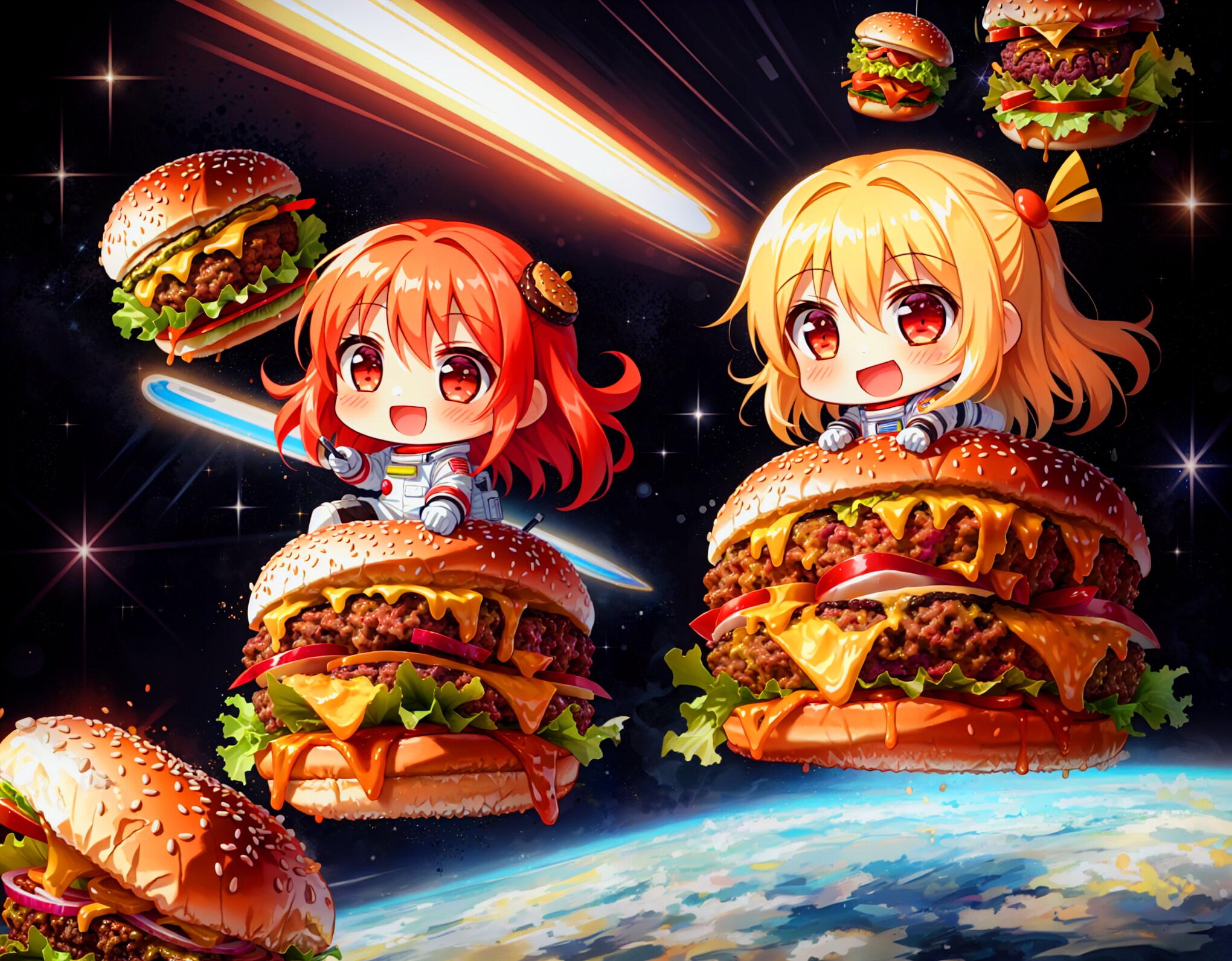 突如宇宙に発生したバーガー流星群に乗るちびキャラをつくってみました。