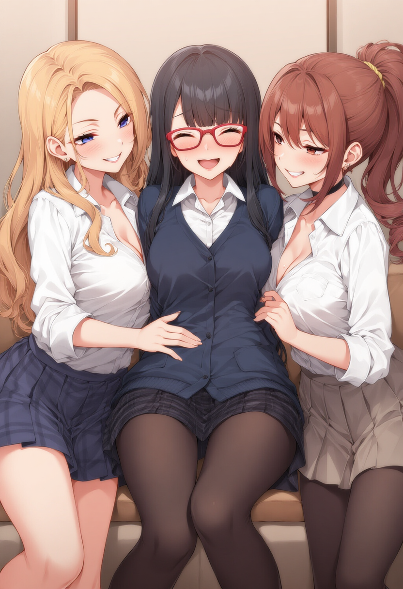 girl, glasses, black hair,long hair, red rimmed glasses, target#tickling, laugh