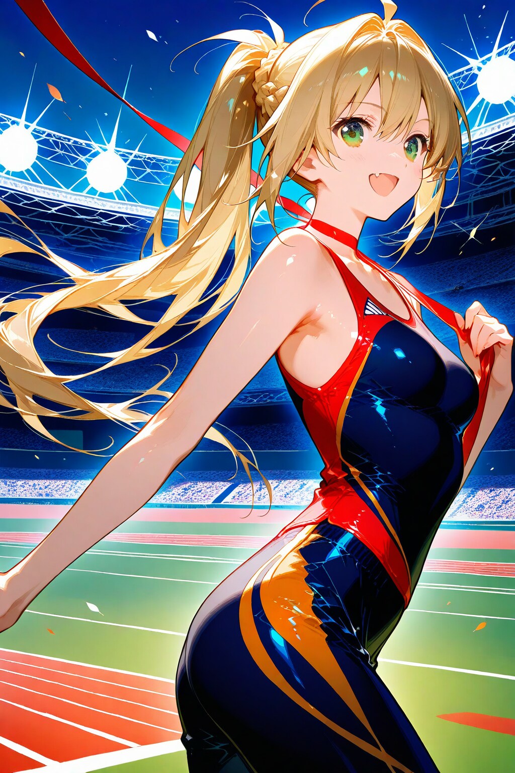 1、appealing to 〔the spectators when the finish tape breaks in a marathon on track at National Stadium, Competition clothing, pants, long ribbon flies, smiling, 〕+フィオナ基本設定(プロンプト欄参照)