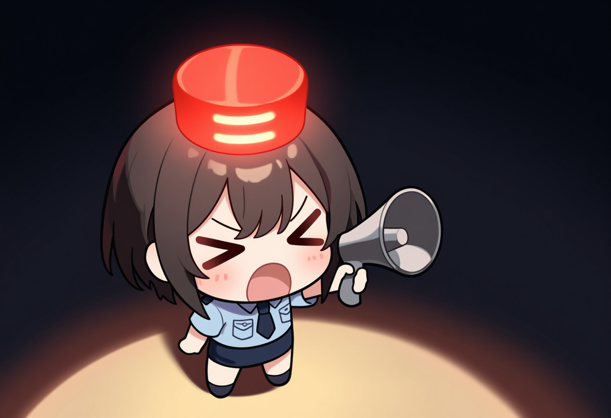 girl, >_<, black hair, short hair, red police siren light on head, chibi, police, holding loudspeaker, shouting