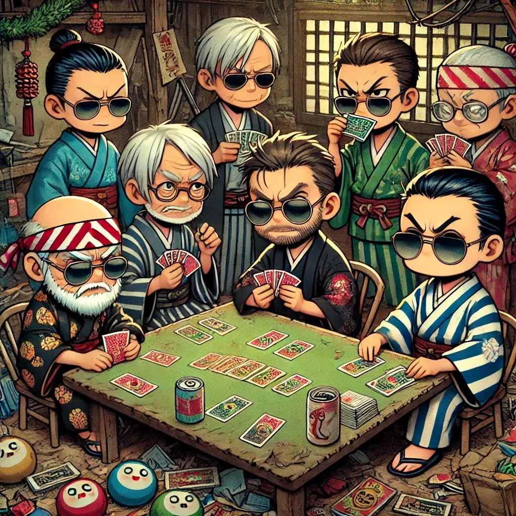 アンダーグラウンドな雰囲気が漂う賭博場で、正月の伝統的な花札ギャンブルを楽しむちょい悪なちびキャラたちが、独特の味わいを生み出していますね。🎴🎍