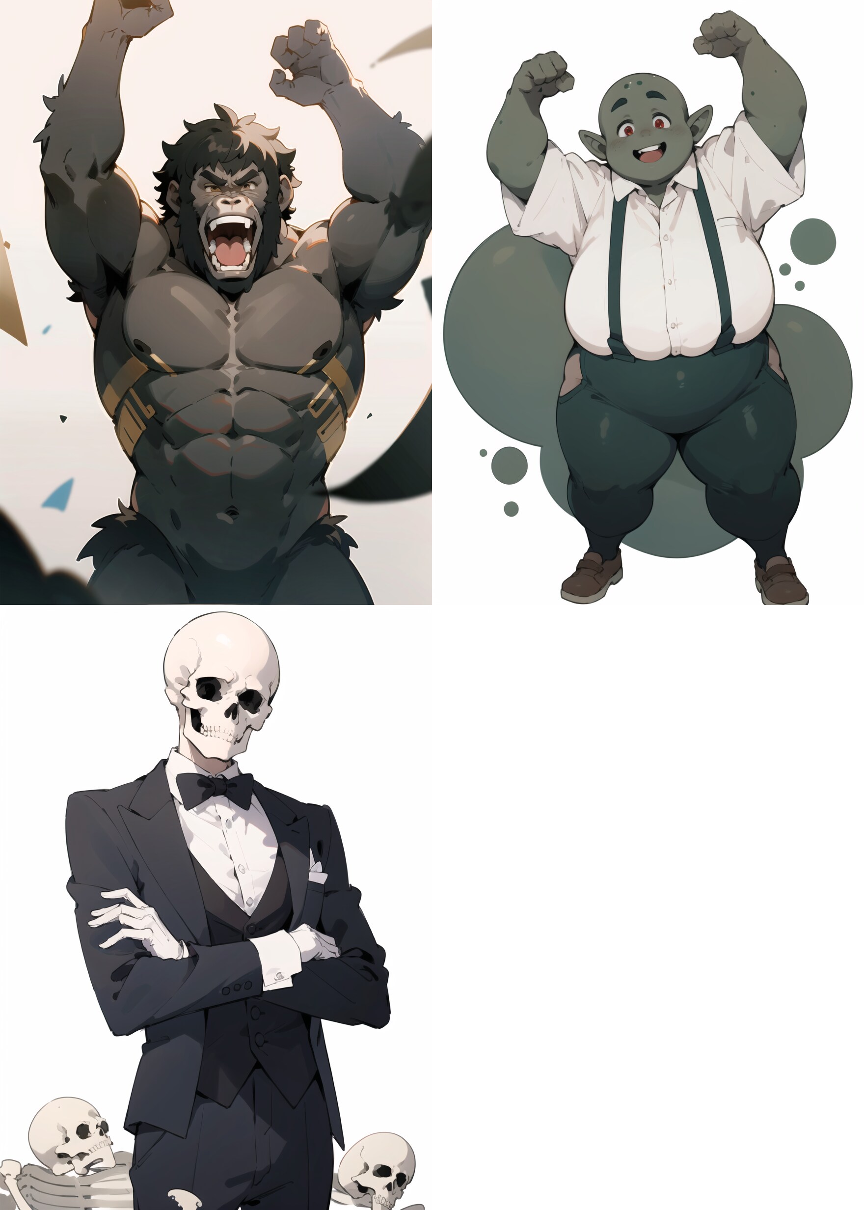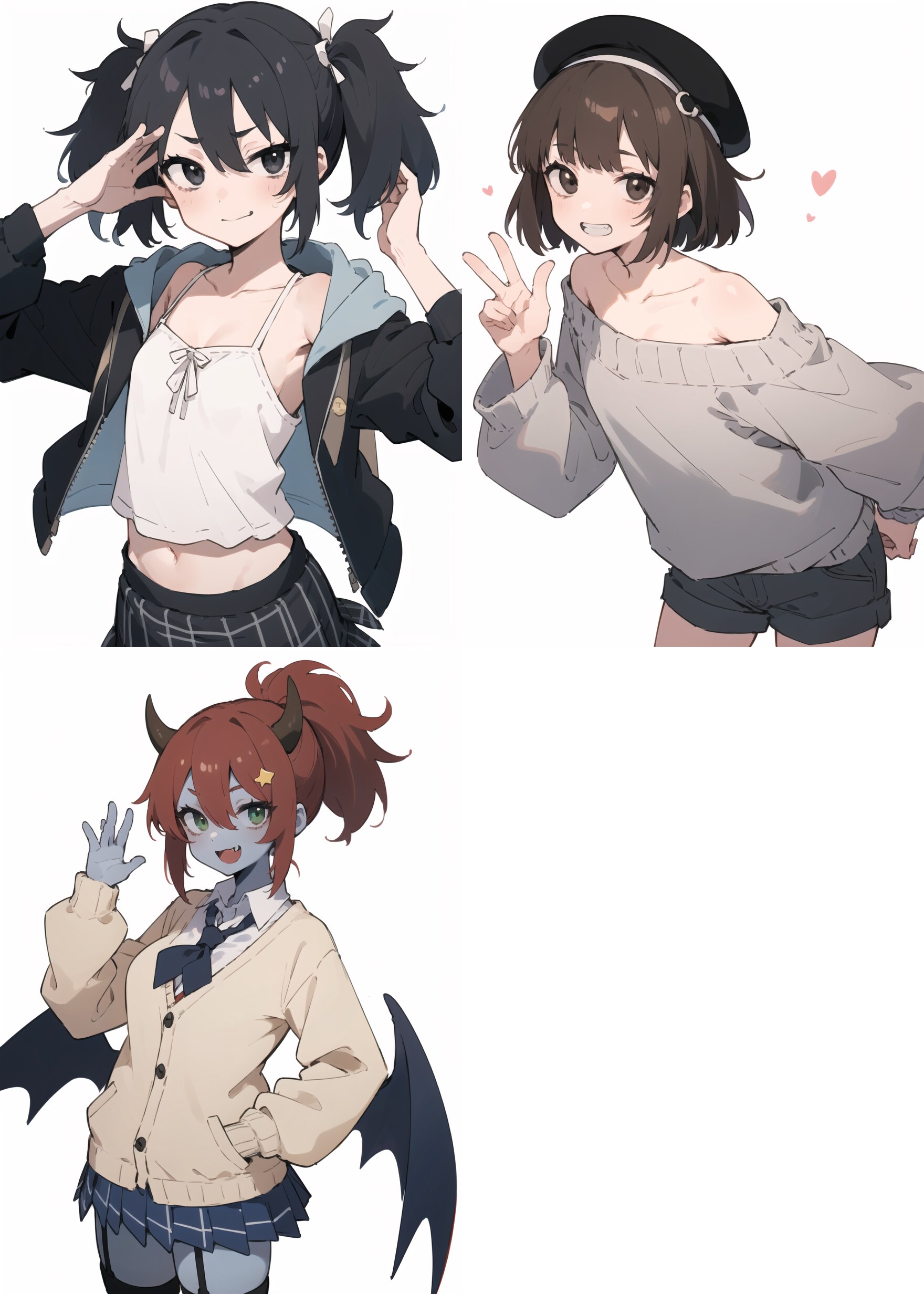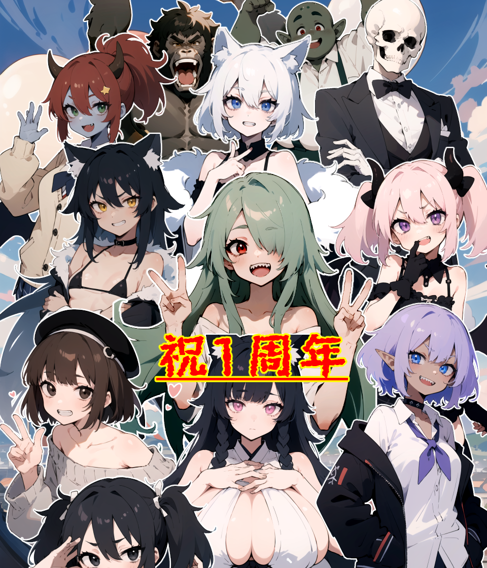 今回はお祝いということで、これまで生成してきた自キャラ(ストーリー系外)を1つのイラストに突っ込んでみました。それぞれ個別で生成して詰め込んでいったので生成呪文は割愛させて頂きました。