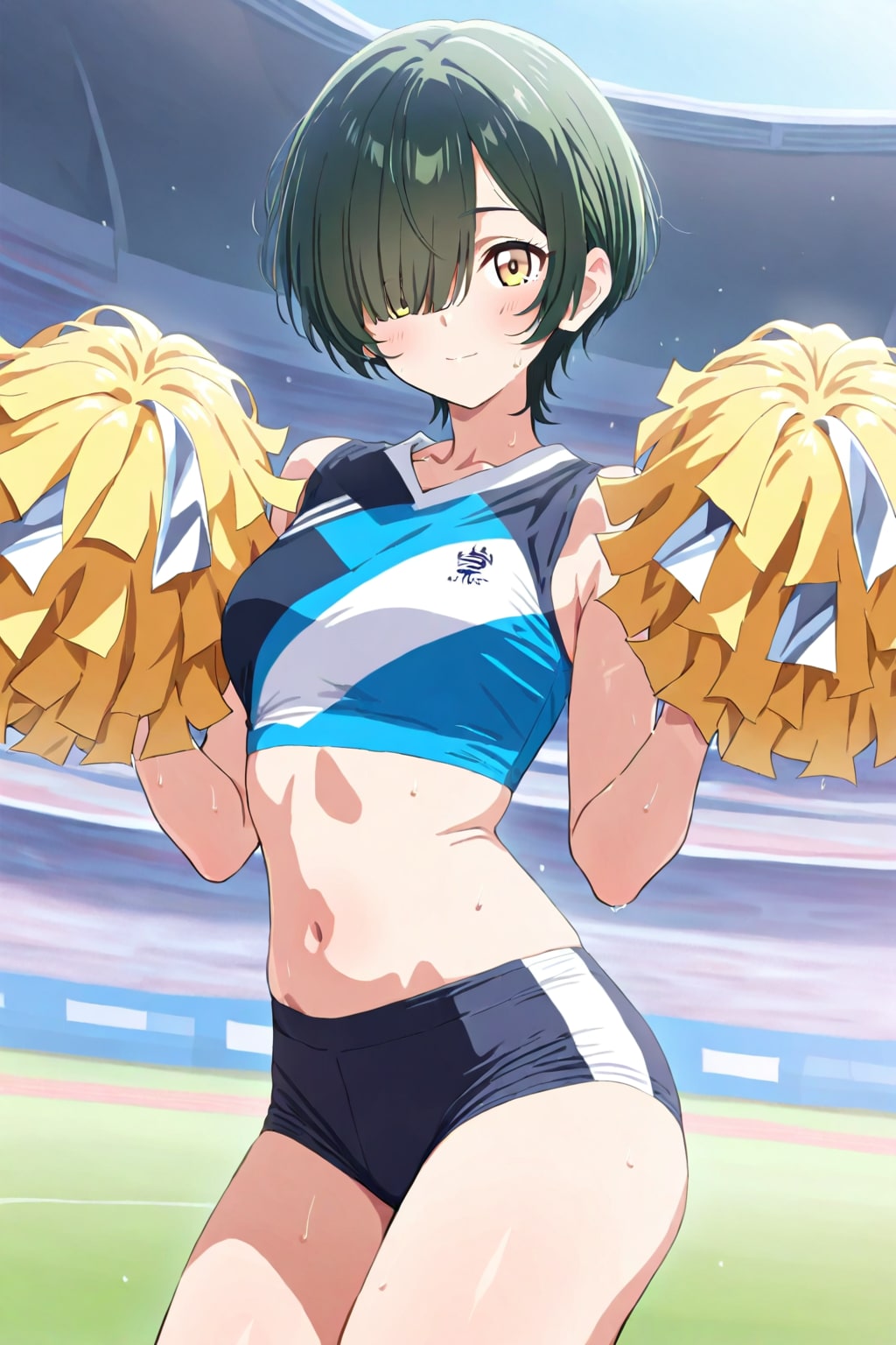 運動に自信が無いからどうしても……という理由で選手からチアガールに急遽変更して貰い、競技者の格好のままボンボンを装着した少女