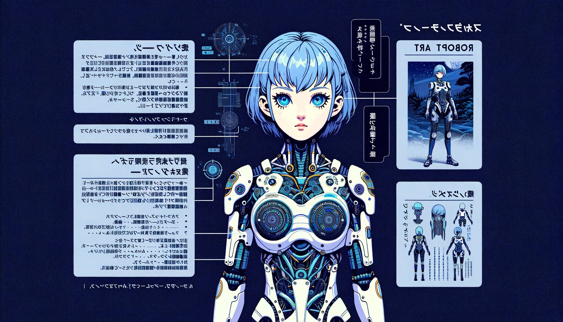 - "ロボット娘"(顔が人間で身体はロボットの特徴を多く持つ女性) の設定画です
