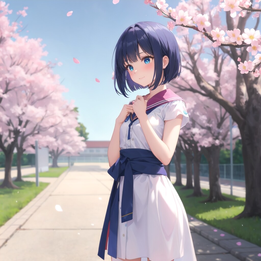 シンプルながら上品な白い膝丈ワンピースに青いリボンのベルトの青髪ボブ子ちゃん。胸元には繊細な花のコサージュ。片手に卒業証書の筒を持ち、誇らしげに空を見上げる。背景は卒業式のために並べられた椅子、遠くのステージ、地面に散る桜の花びら。