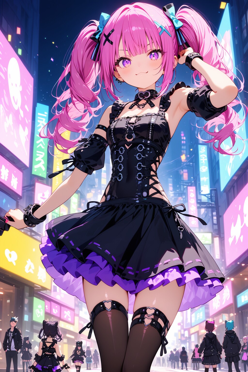 パンク系ゴスロリファッションの可愛い女の子がカラフルな光が溢れる街でスタイリッシュなポーズをしている。