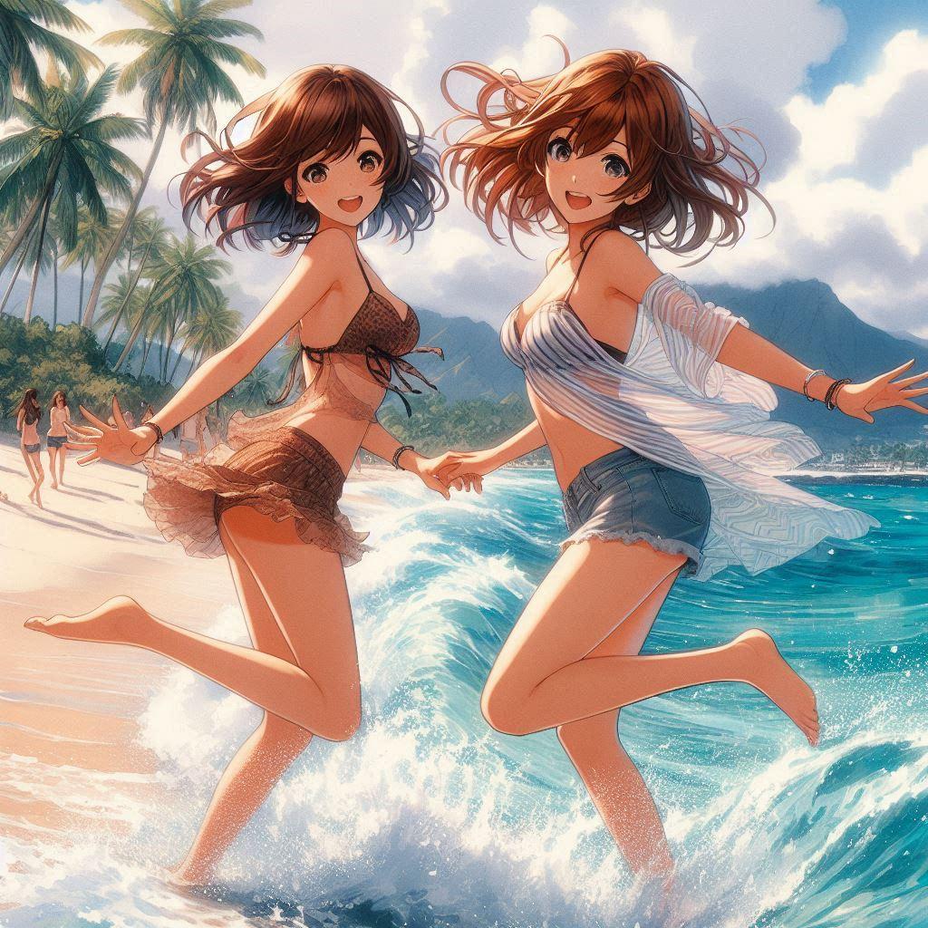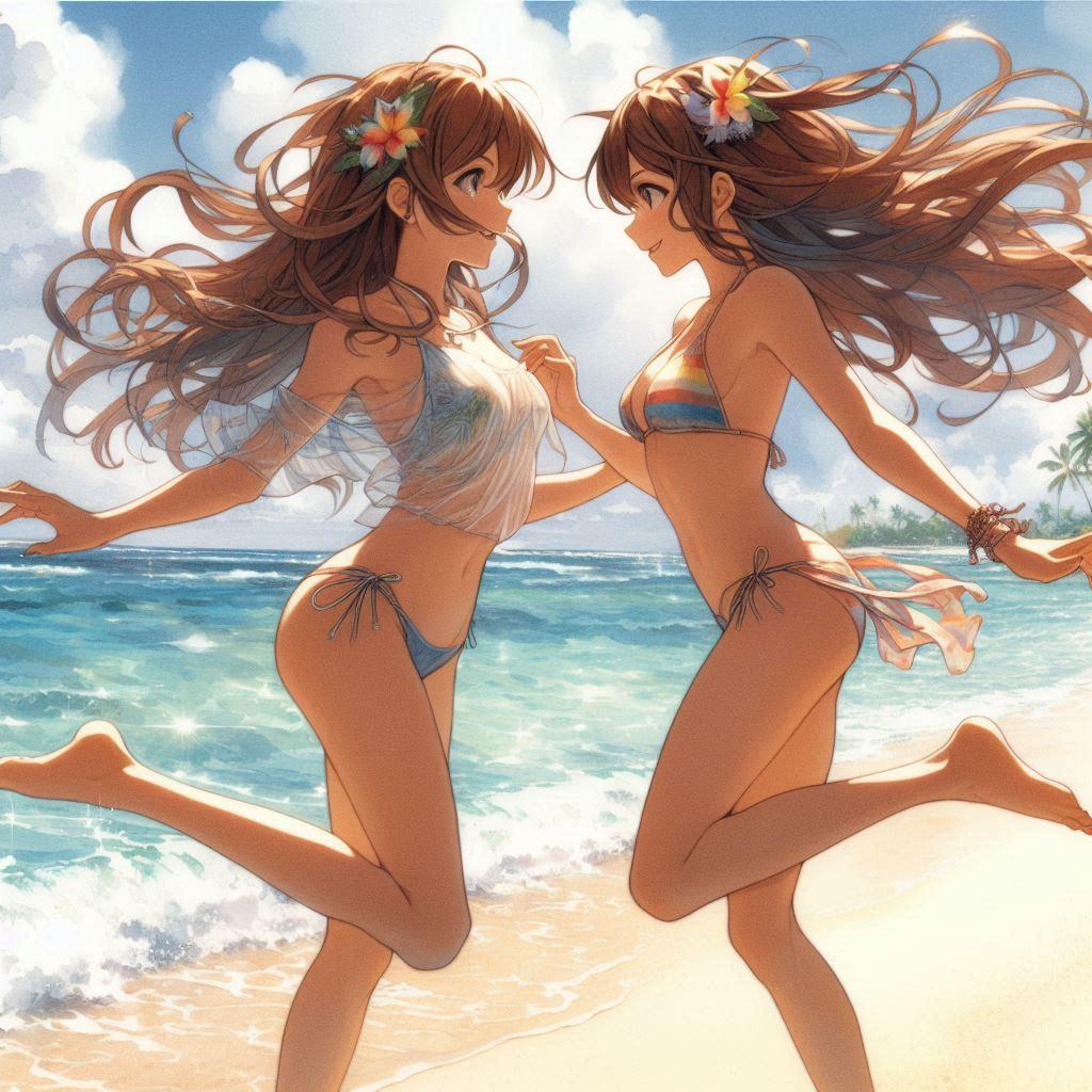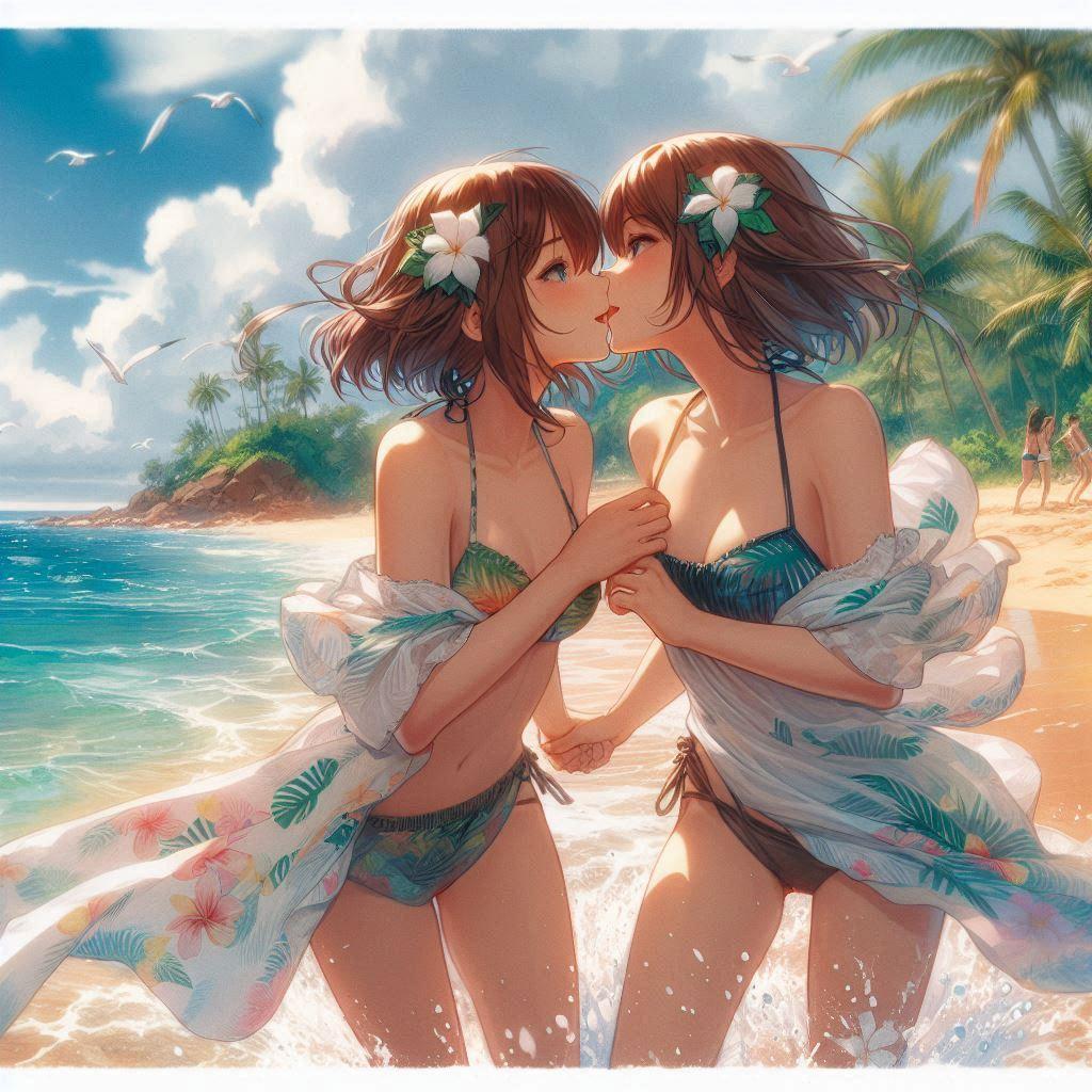 Dalle先生で”水着”という単語無しで水着を実現できたのでご報告♪(投稿作品名は”南国満喫!イチャイチャ百合カップル♪”です)