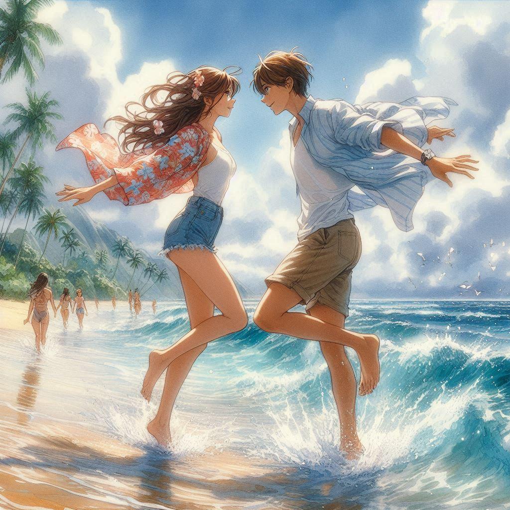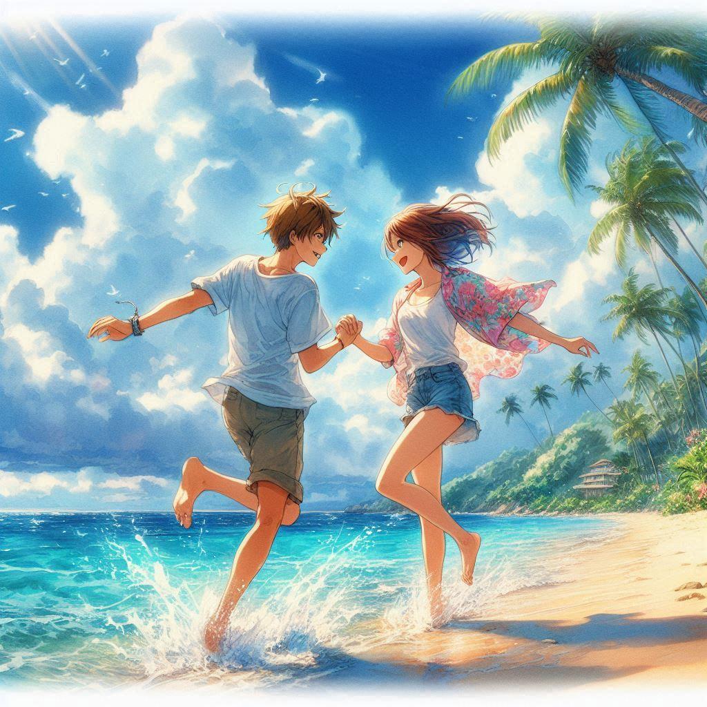 あと、同時刻に別投稿した水着少女は、↑の呪文から”愛し合う二人”を省いたもので出力された物です。