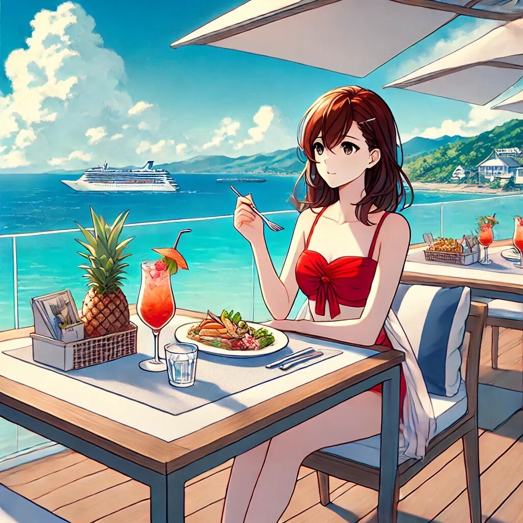 ChatGPTで作った海の見えるレストランで食事をする、水着姿の女性です。