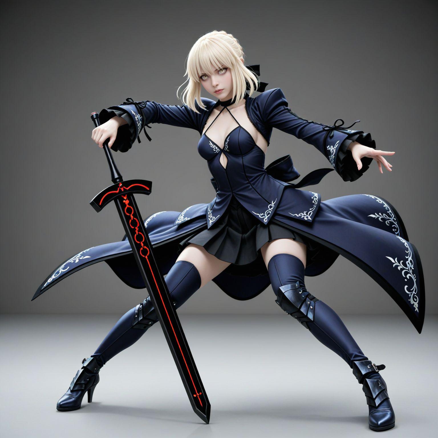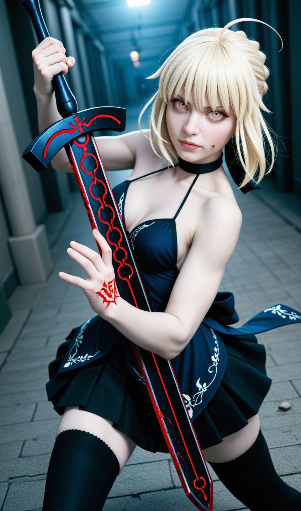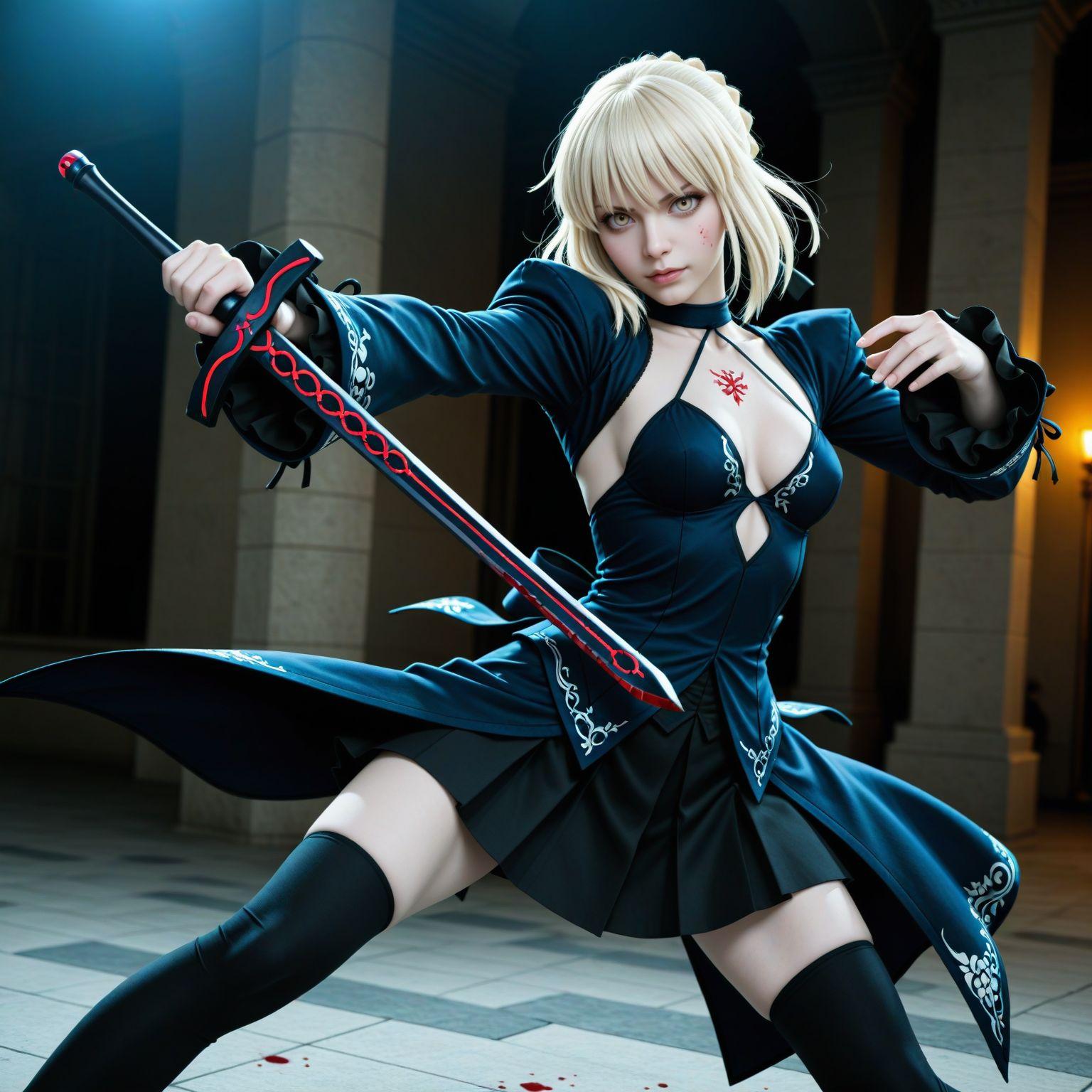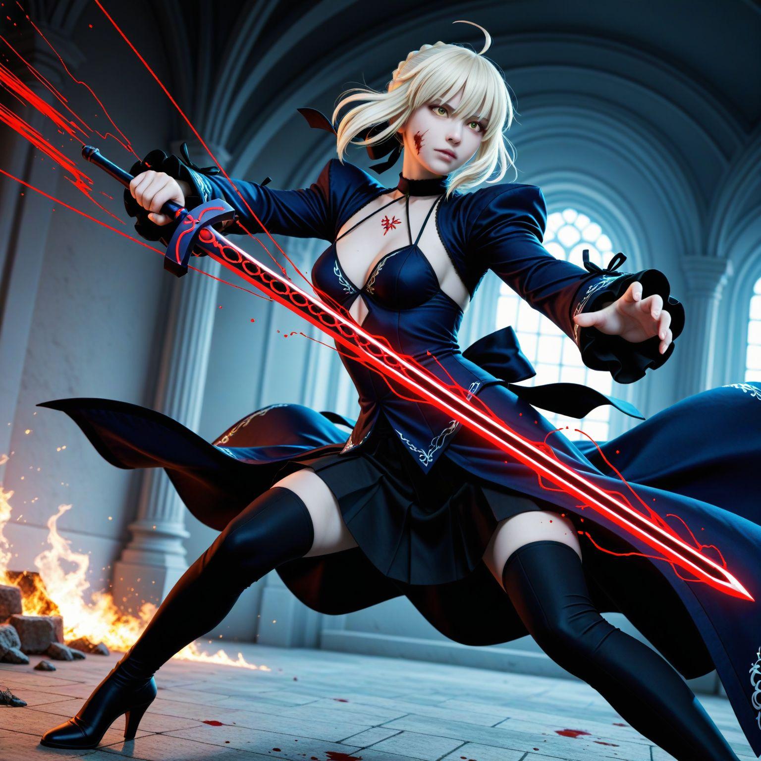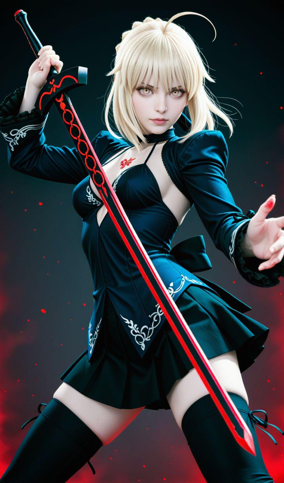 光を拒むかのようなドレスラインと、魔力を帯びたエクスカリバーの赤い閃光。令呪が刻まれた右手は、かつての忠誠を裏切るための象徴となり、その瞳は人間性への最後の警告を宿している。背景の深いグラデーションがキャラクターの孤独と威圧感を引き立て、「Fate/stay night (HF)」における彼女の役割を、リアリズムと象徴性で重層的に描いています。