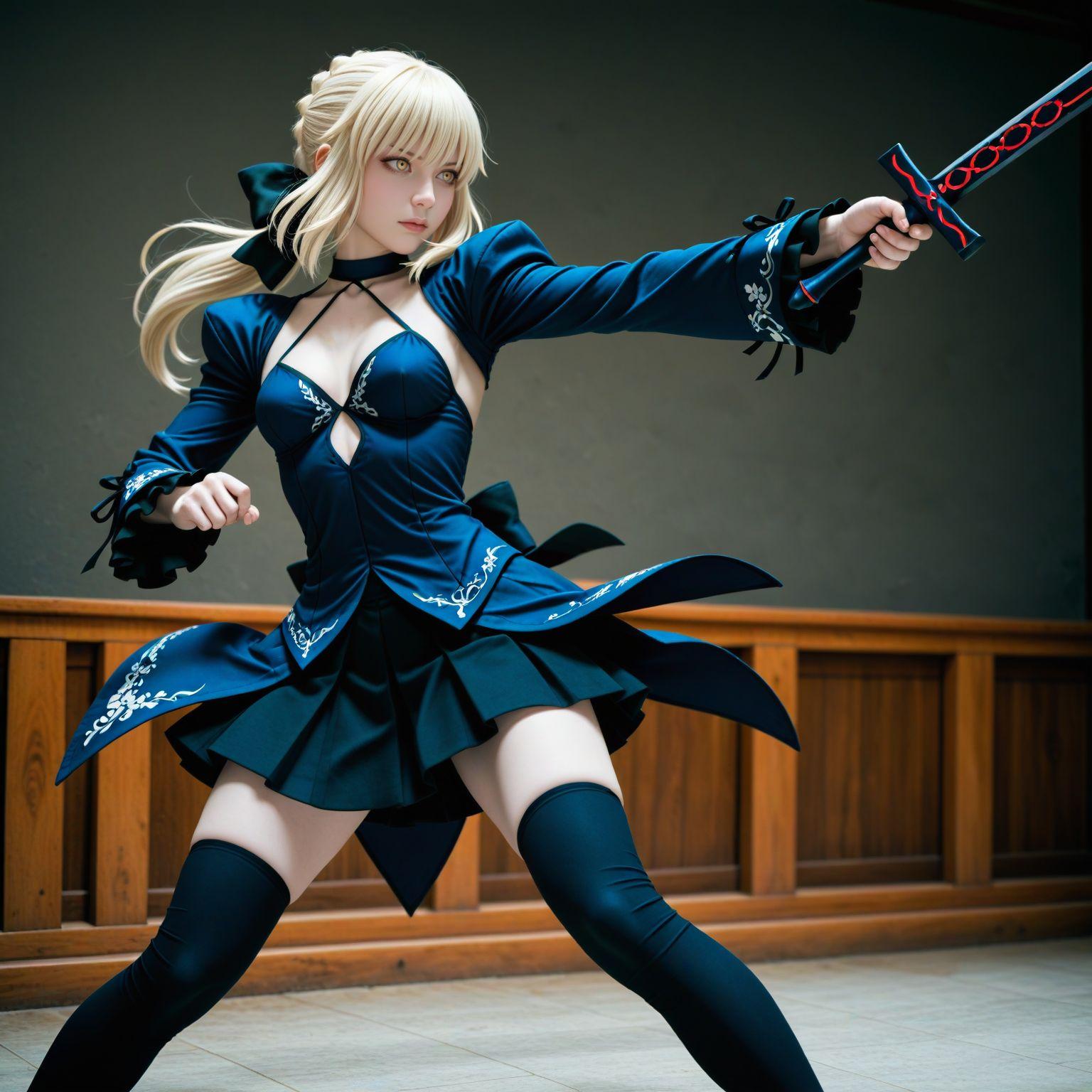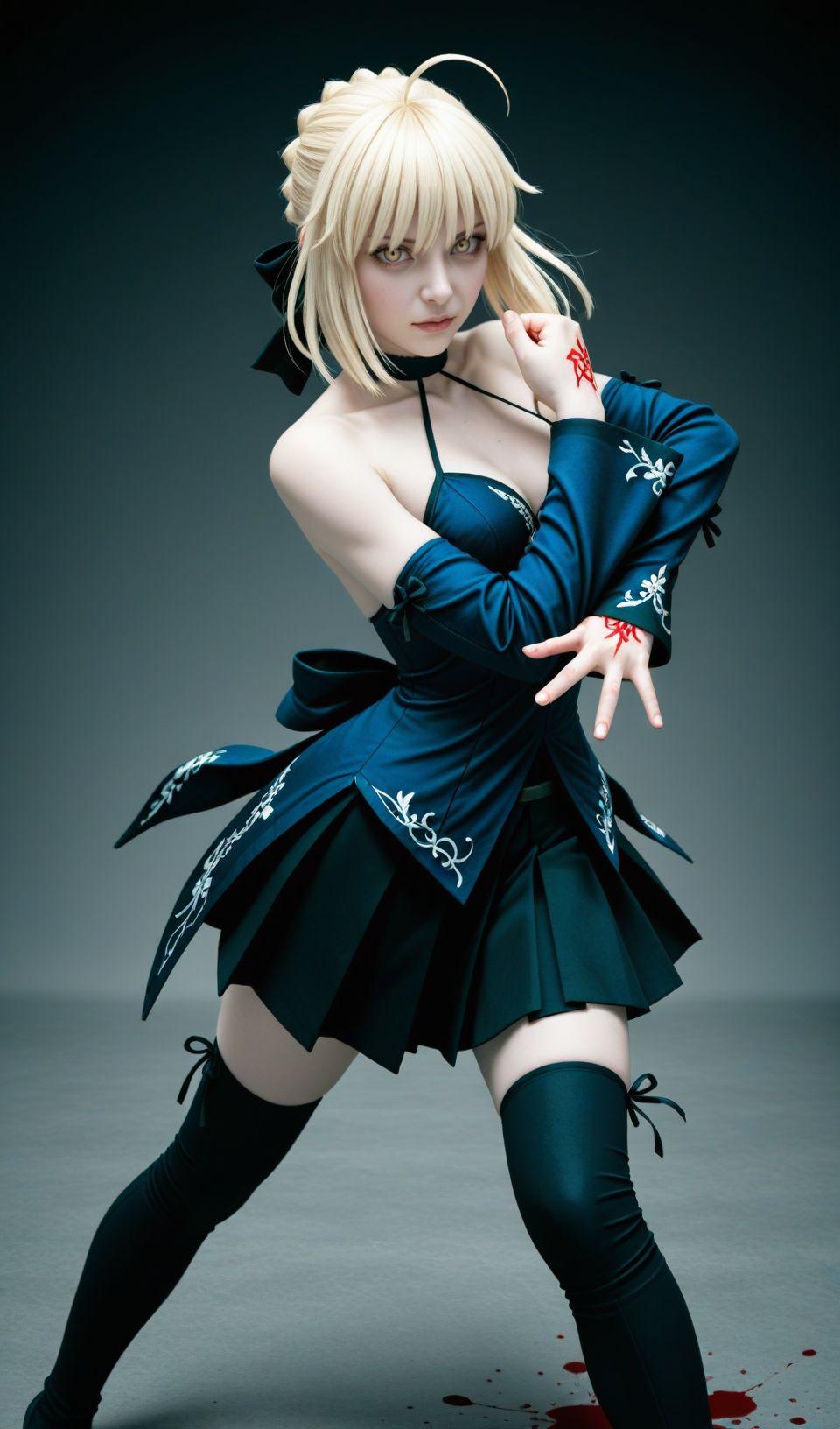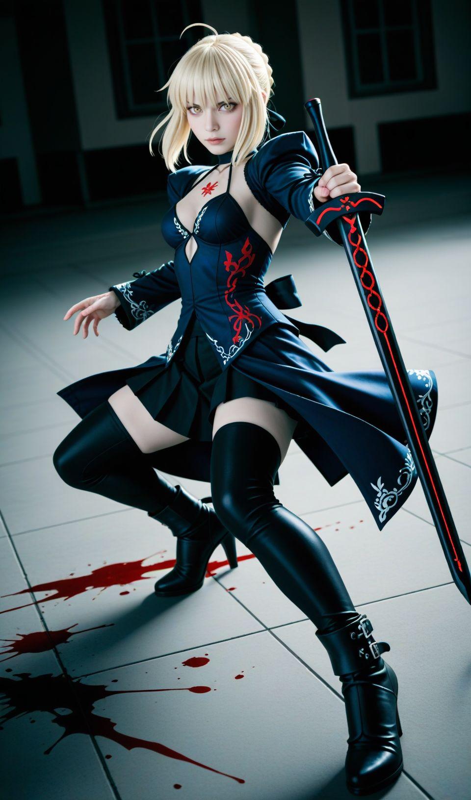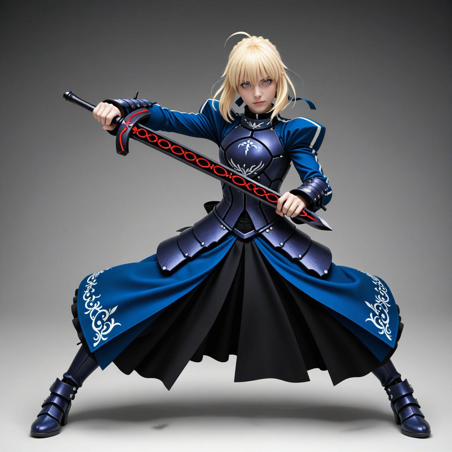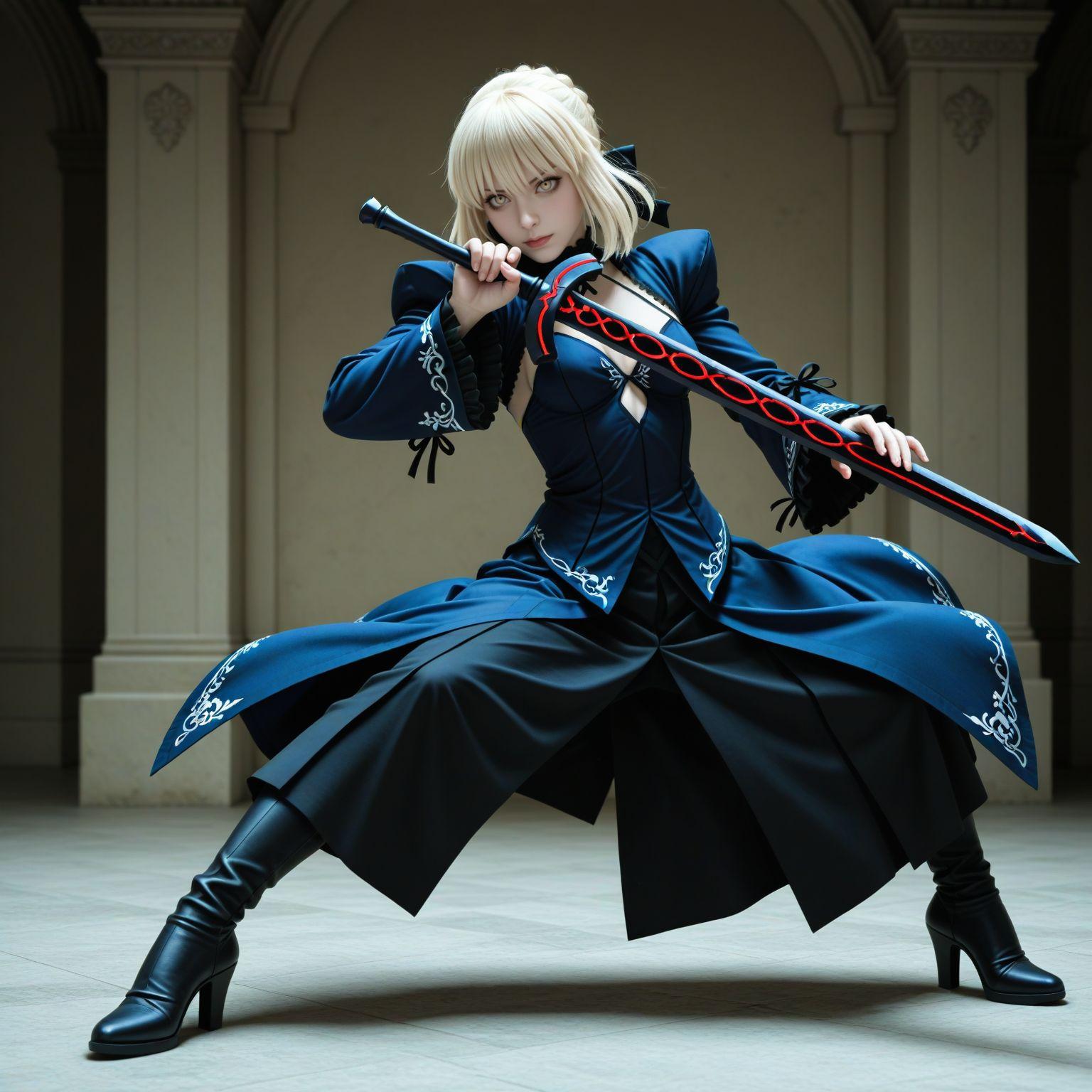 光を拒むかのようなドレスラインと、魔力を帯びたエクスカリバーの赤い閃光。令呪が刻まれた右手は、かつての忠誠を裏切るための象徴となり、その瞳は人間性への最後の警告を宿している。背景の深いグラデーションがキャラクターの孤独と威圧感を引き立て、「Fate/stay night (HF)」における彼女の役割を、リアリズムと象徴性で重層的に描いています。