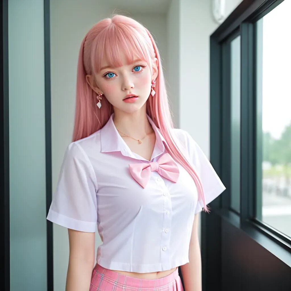 窓際に立つ、ピンク髪の女性。彼女の柔らかな髪色と青い瞳は、室内の穏やかな明るさと調和しています。ピンクのリボンのネクタイとチェックのスカートが、若々しさとスタイルのセンスを強調しています。