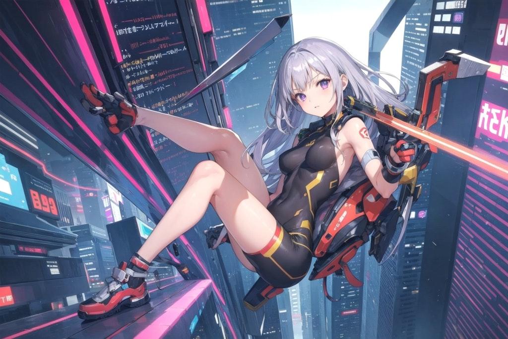 ① 銀髪サイバーパンク(重力無視のバトルアクション)_20231219 (25いいね)