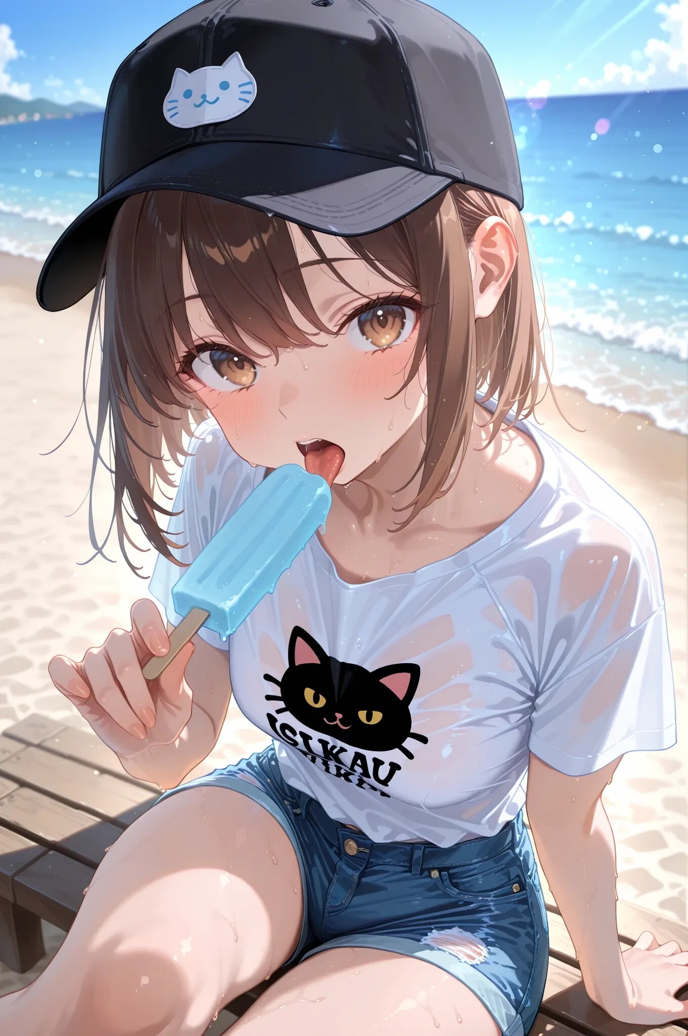海辺でアイスを食べる