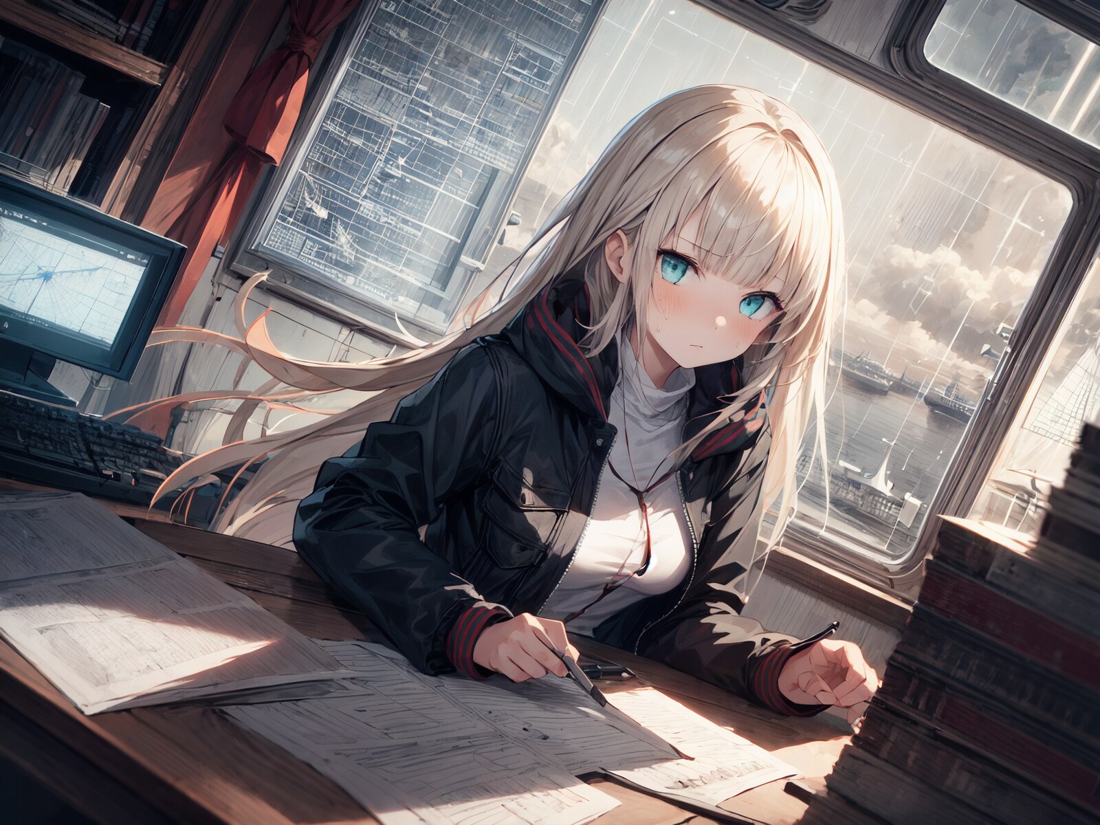 船内で海図を見ながら外の悪天候をどういう航路を通ればいいか…と悩んでいるシチュエーションとしました