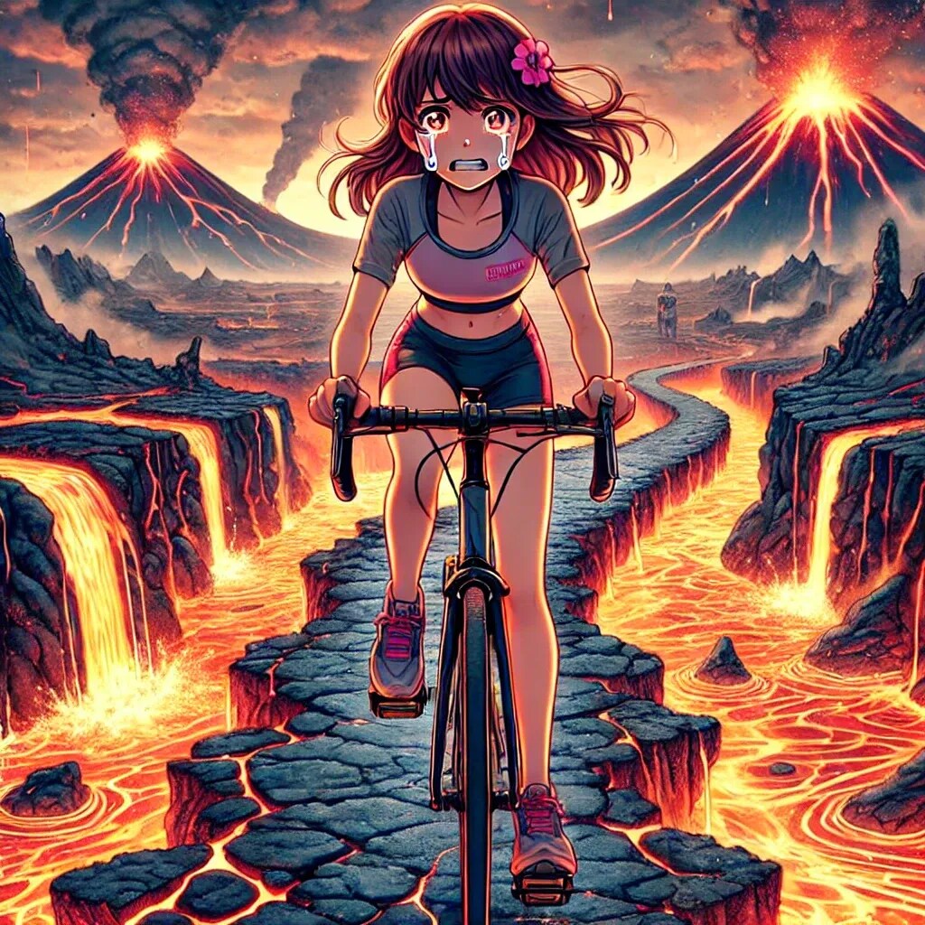 燃える溶岩や火山の風景が緊張感を高め、まさに壮大な冒険の一瞬を切り取ったような作品になっていますね。 🔥🚴♀️🌋