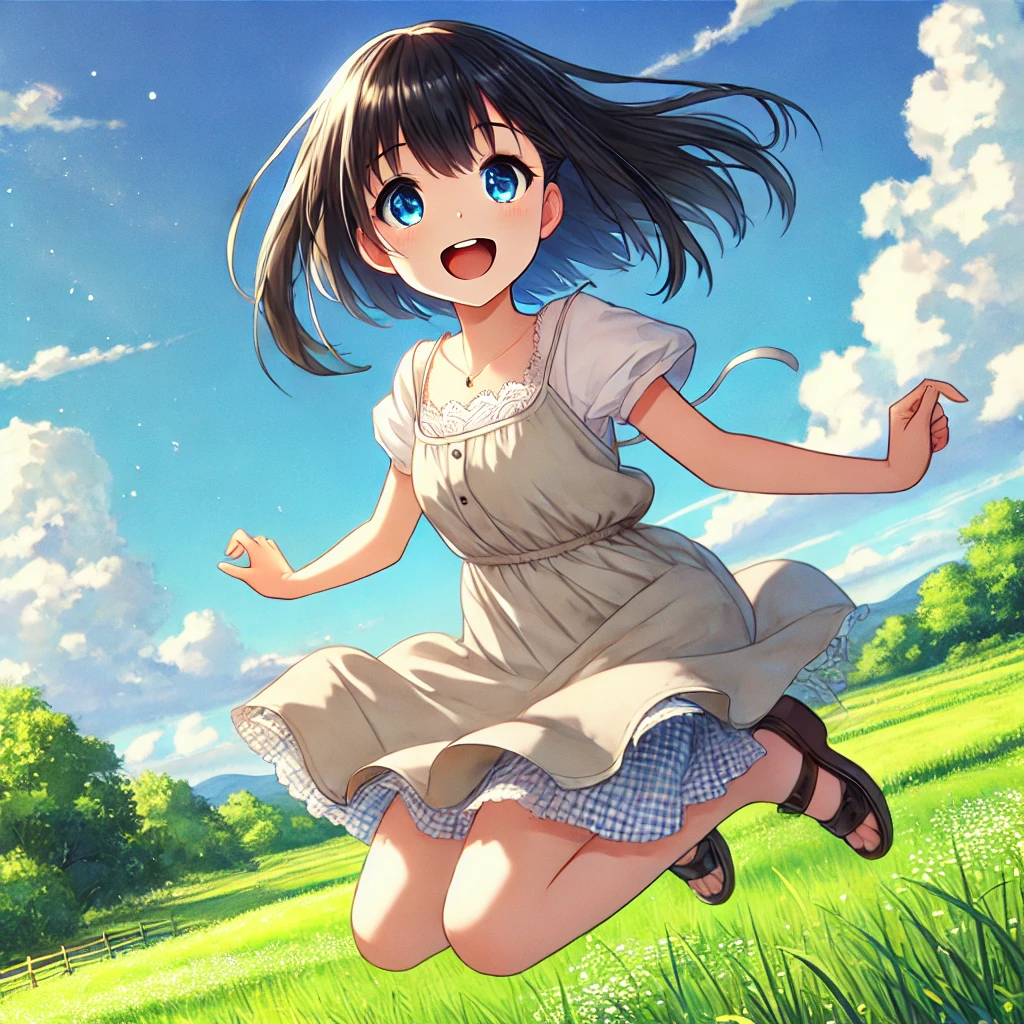 青空の下、草原を駆け抜けてジャンプするさやかちゃん。額から伸びたアホ毛が風に踊り、無邪気な笑顔が大地を明るく照らす。
