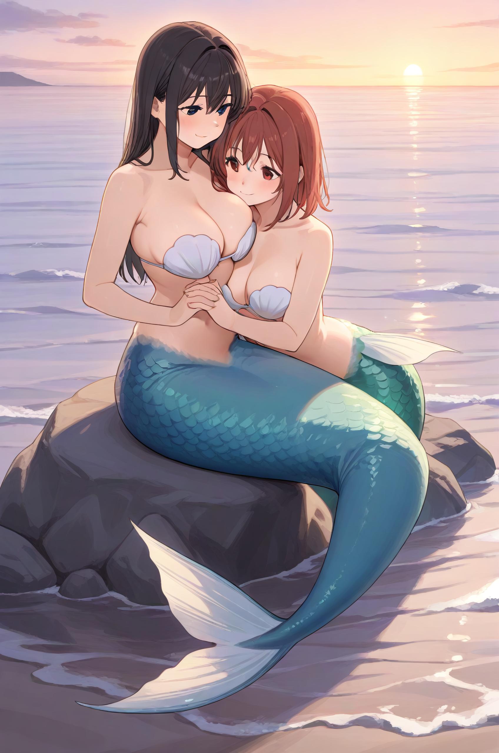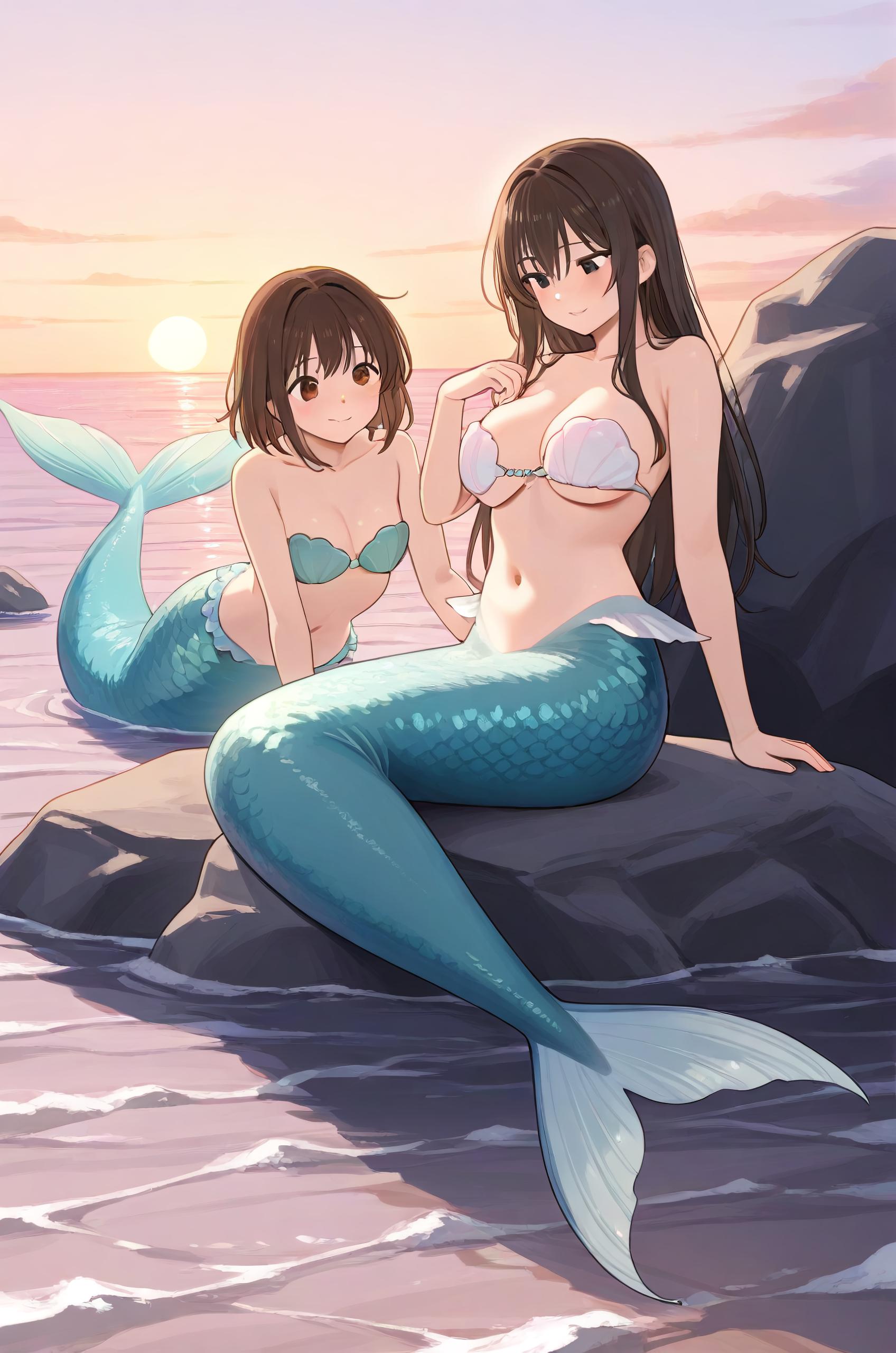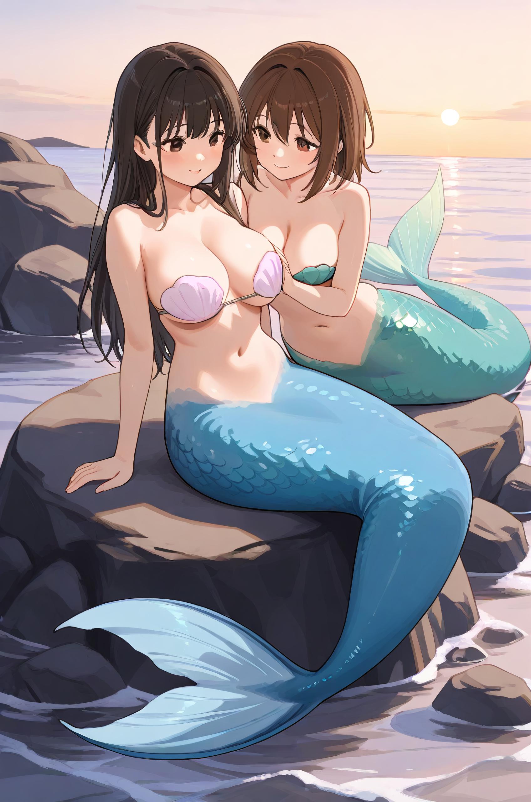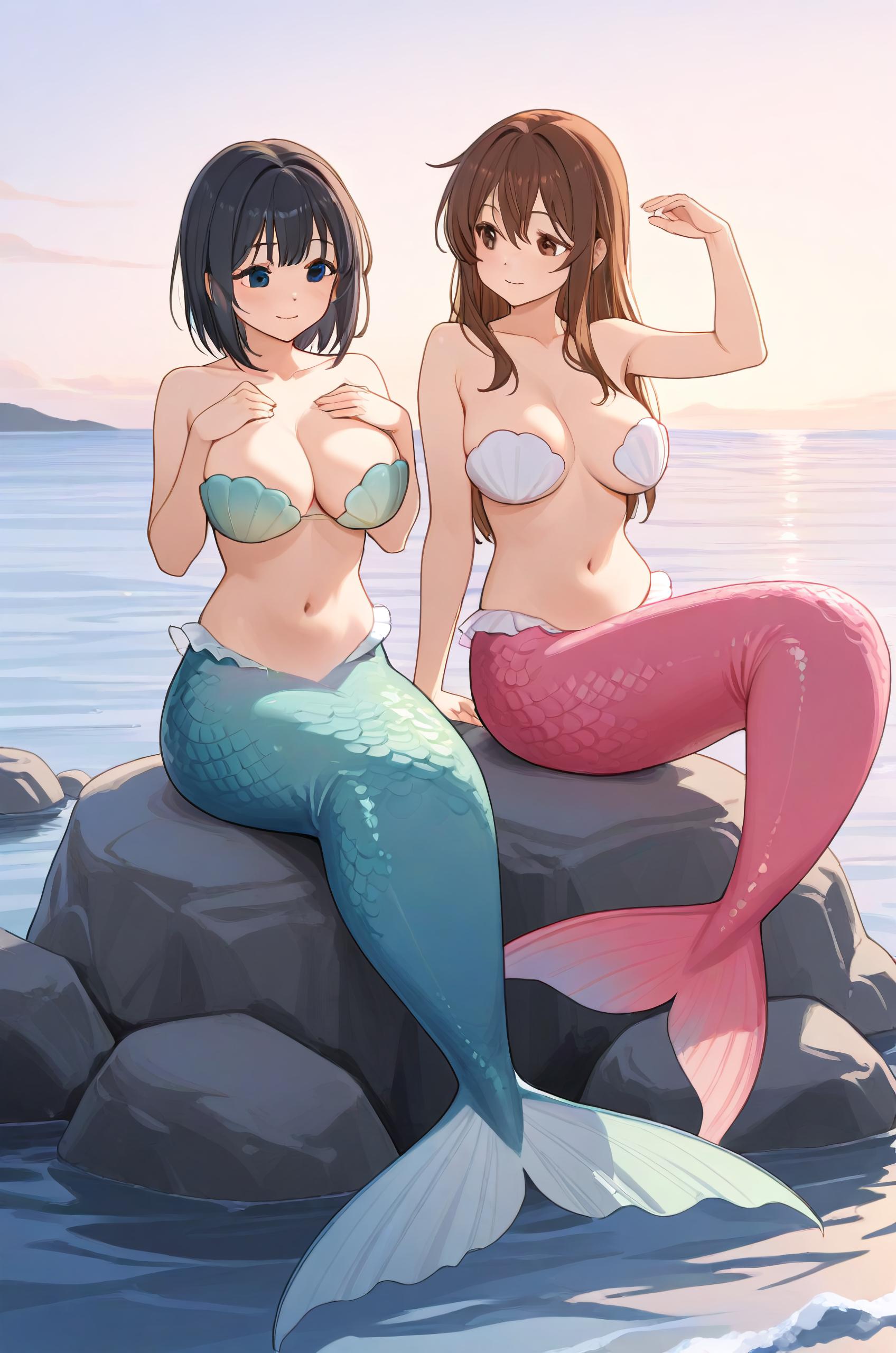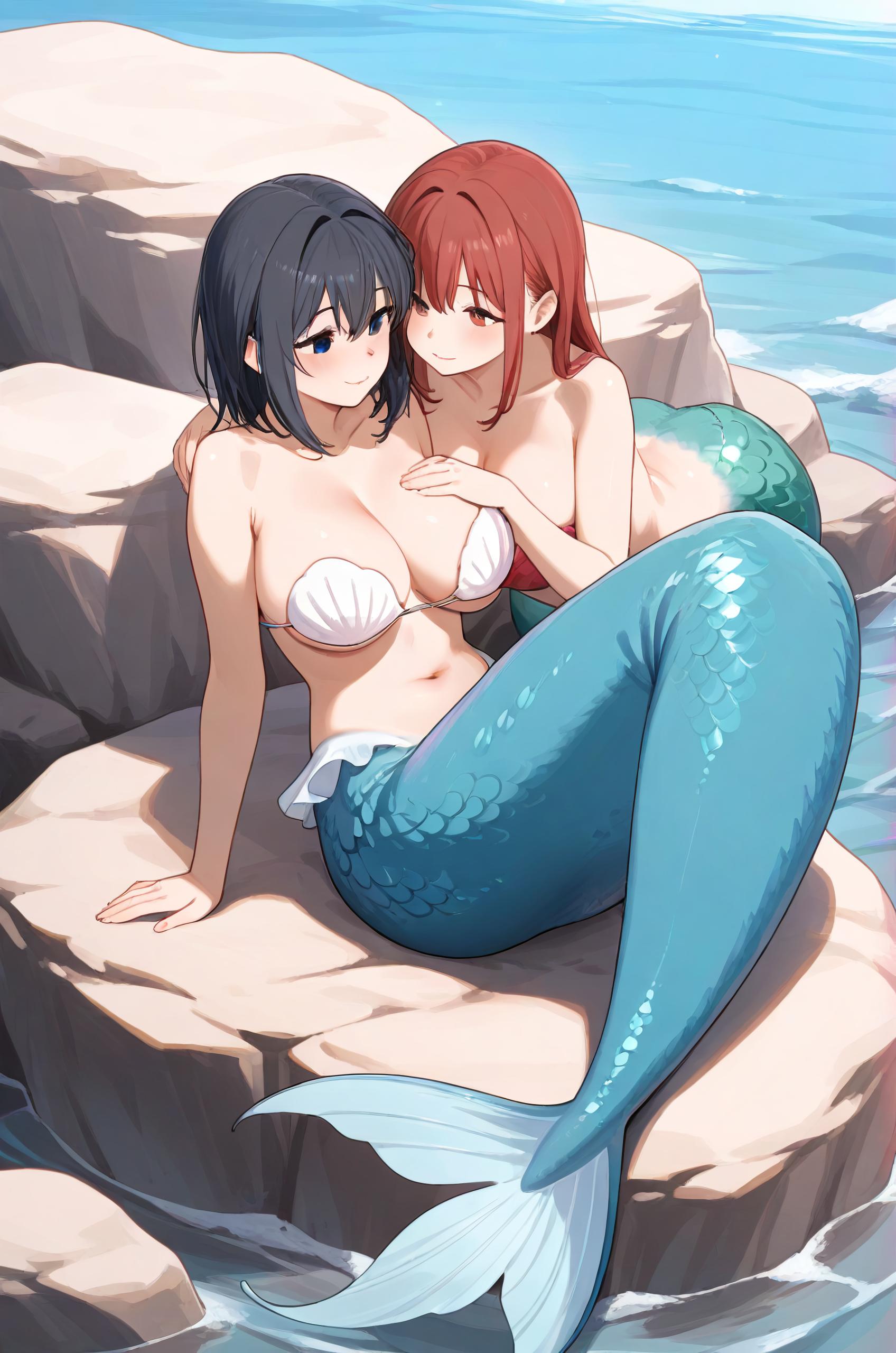 きれいな海の岩場でマーメイドトークでもしているんでしょうかね