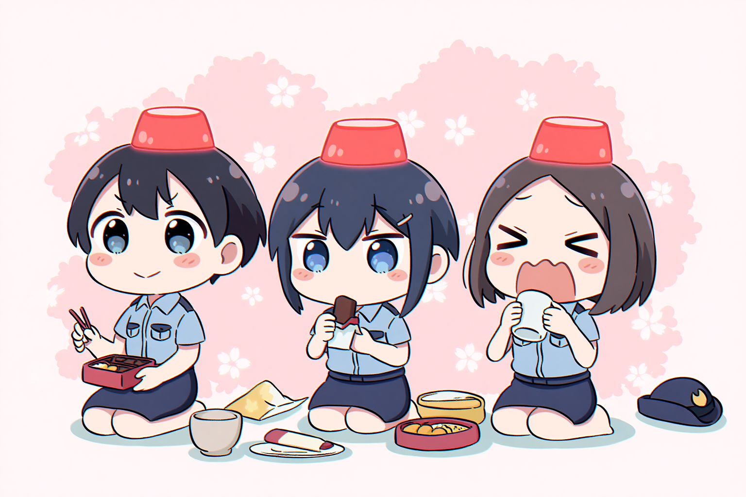 girl, blue eyes, black hair, short hair, red police siren light on head, chibi, police, wariza, eating bentou,