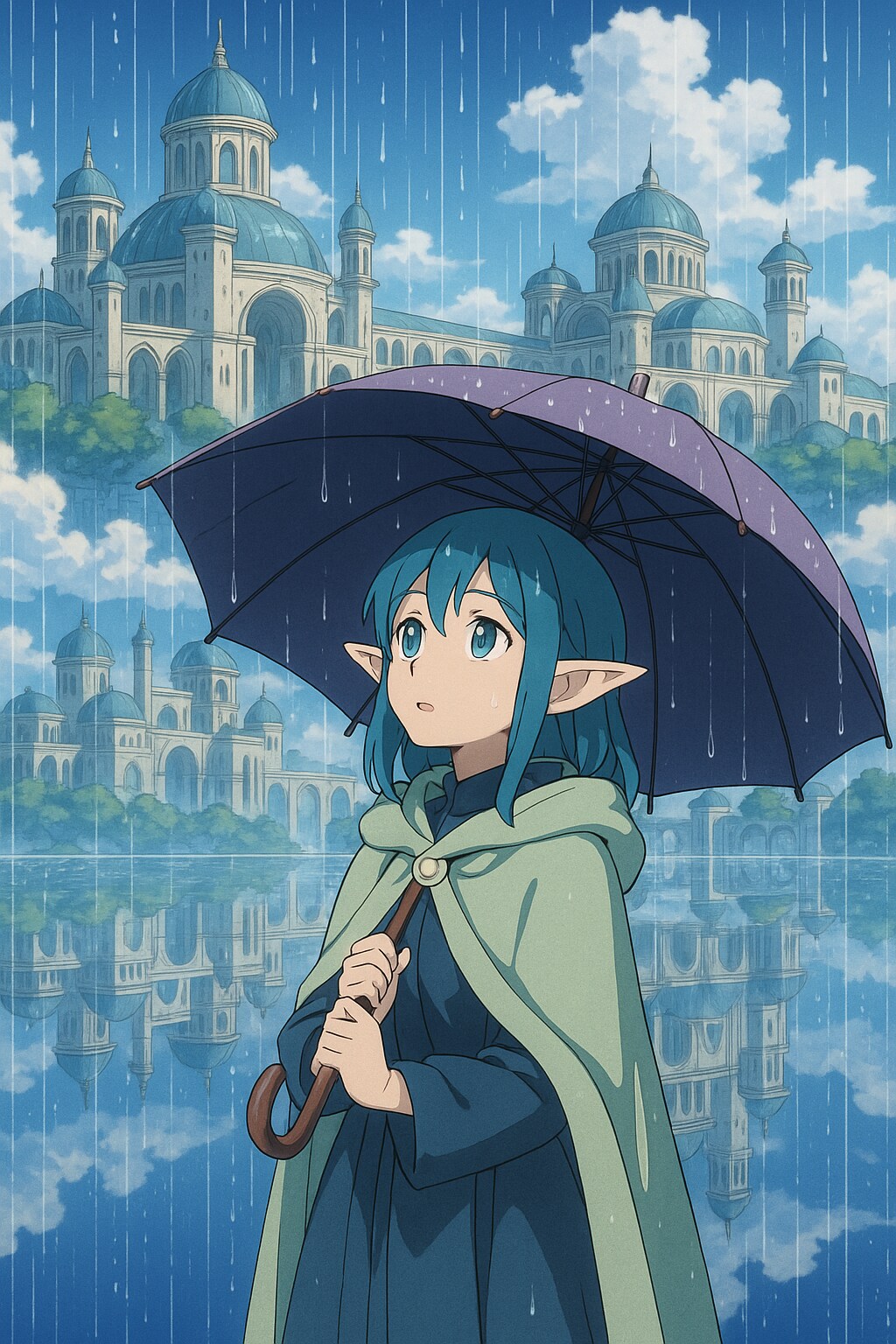 この都市は“雲の海”の上空に静かに浮かぶ、青と白の光で構成された幻想建築群。その最大の特徴は、地上にも空にも属さず、空間ごと巨大な「水鏡」に包まれていることです。雨が降るたび、街のすべてが完璧な反射として地表に現れ、訪れた旅人は上下が逆転したような感覚に包まれます。
