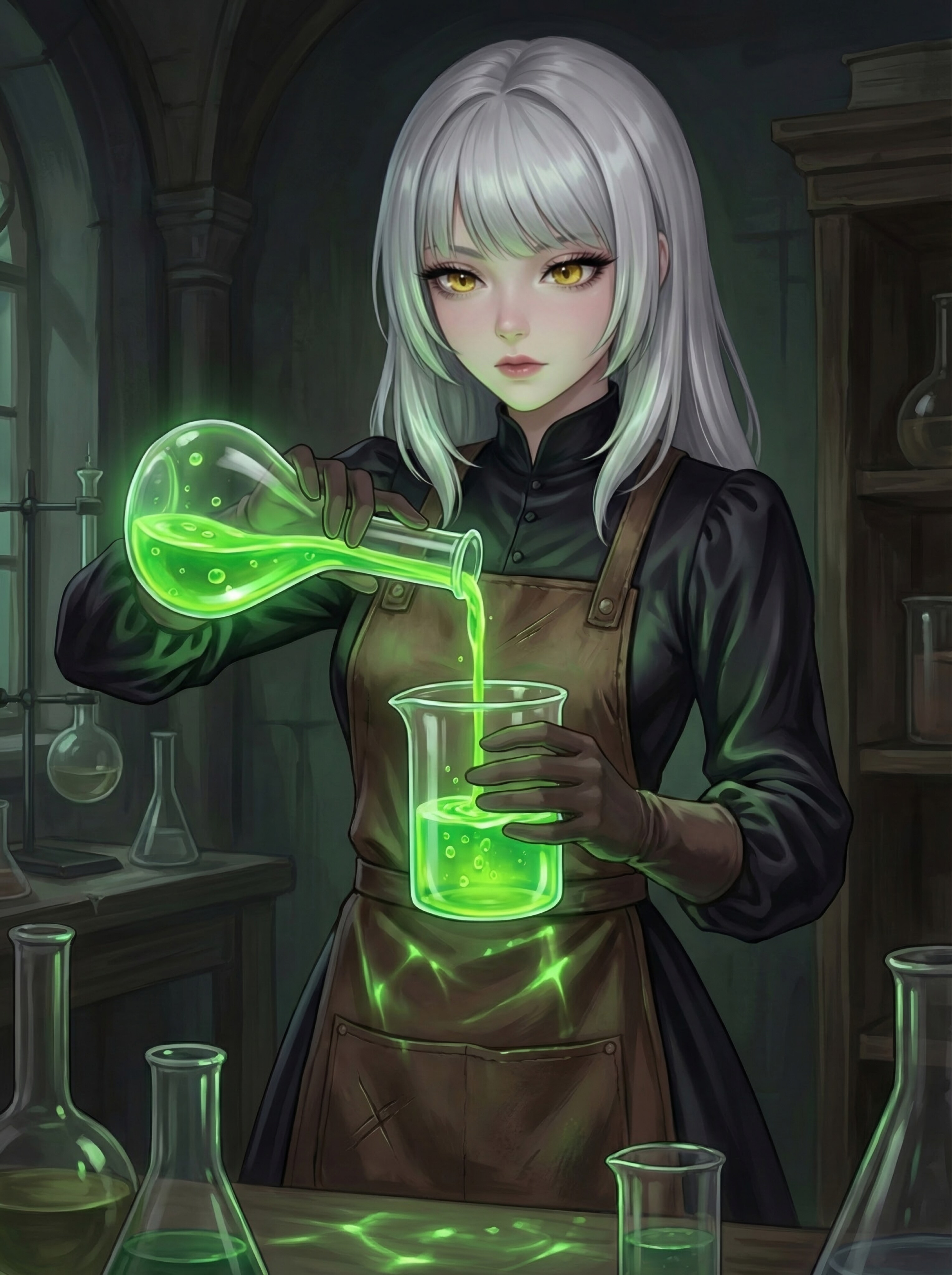 ・Material: 「Worn Leather (使い込まれた革)」のエプロンと、「Silk Satin (シルクサテン)」のドレスの質感を明確に描き分けました。