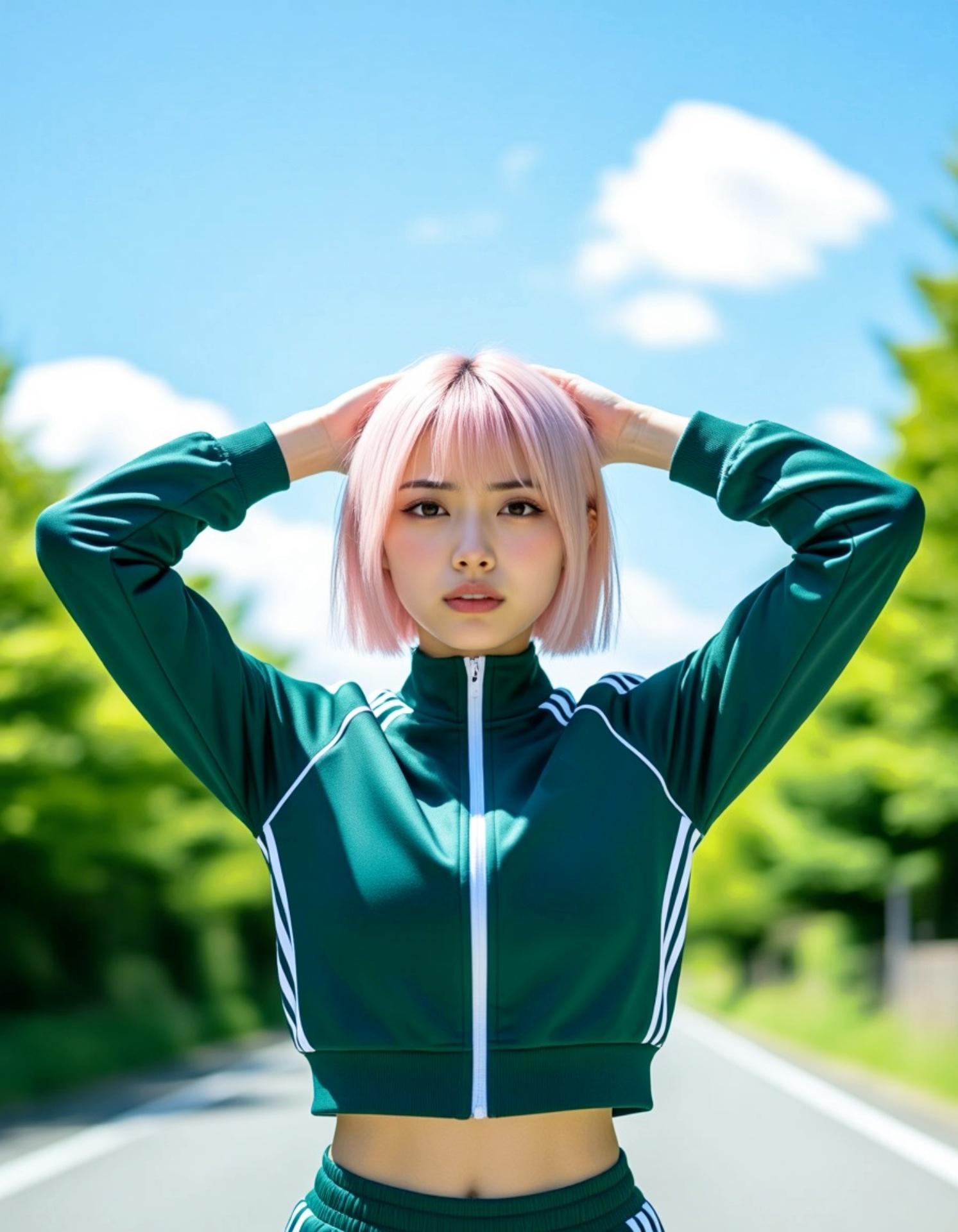 まず、背景には澄み渡る青空とふわふわと浮かぶ白い雲を配置し、開放感と軽やかさを演出。両脇に広がる緑の木々と、遠くに伸びる道が、彼女の立つ場所に物語性と奥行きを与えています。構図には浅い被写界深度を用い、モデルの存在感を際立たせつつ、背景を柔らかくぼかすことで、現実と夢の境界を曖昧にしました。