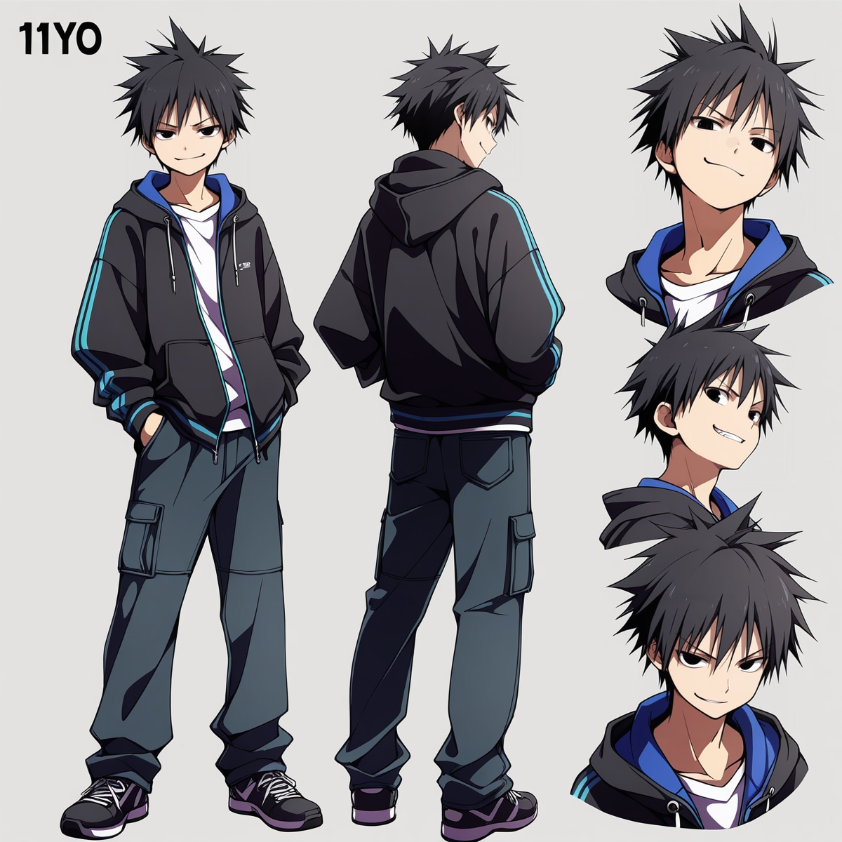 (1boy), (11yo:1.1), (spiked black hair), (smirk), (black eyes), (covered penis:0.8),