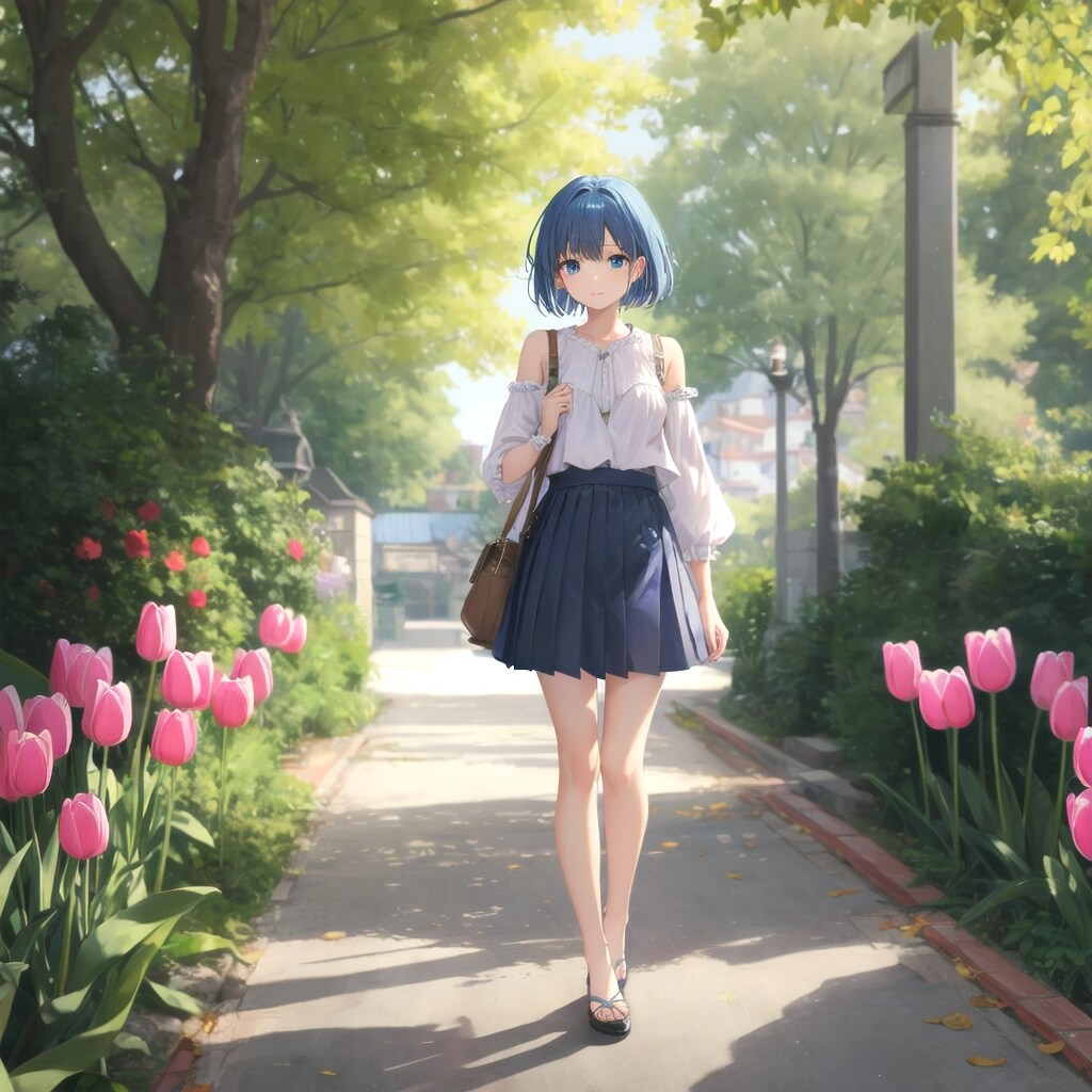 春らしいチューリップ柄の白いブラウスとライトグリーンのプリーツスカートを着た高校生モデル青髪ボブ子ちゃん。爽やかで若々しい雰囲気。庭園の石畳の小道を歩き、木漏れ日がふんわりと降り注ぐ。スカートが春風に軽く揺れる。