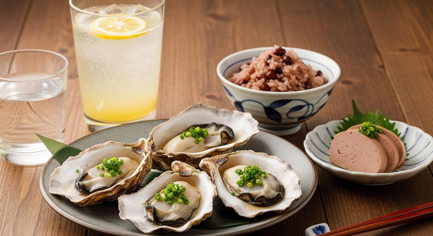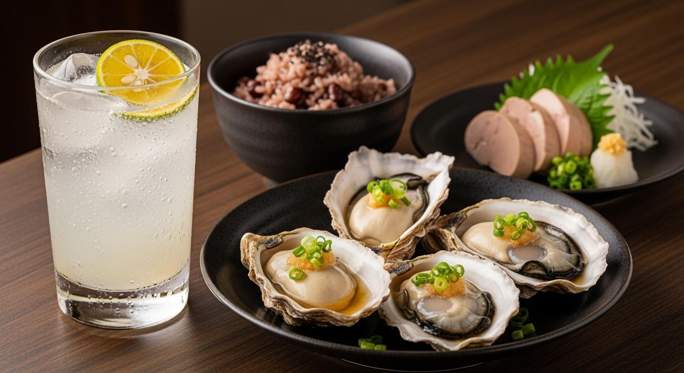 牡蠣の酒蒸し、ゆずサワー、赤飯、あんきも