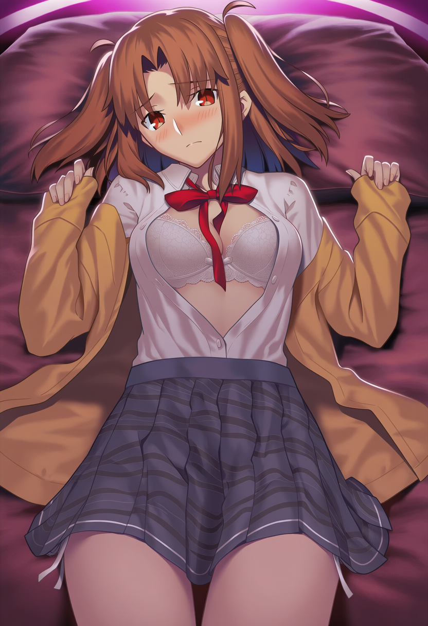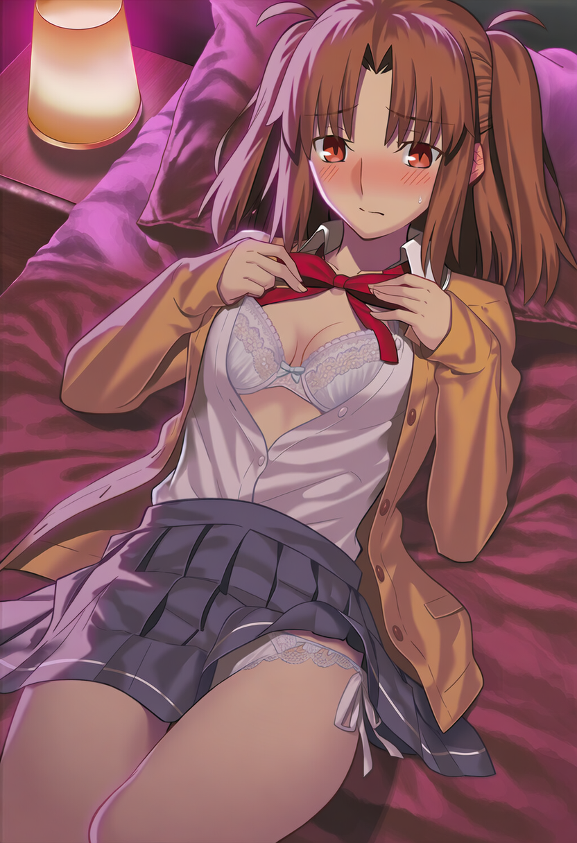 ピンクの照明の中、さつきは制服のままベッドの端に座っていた。