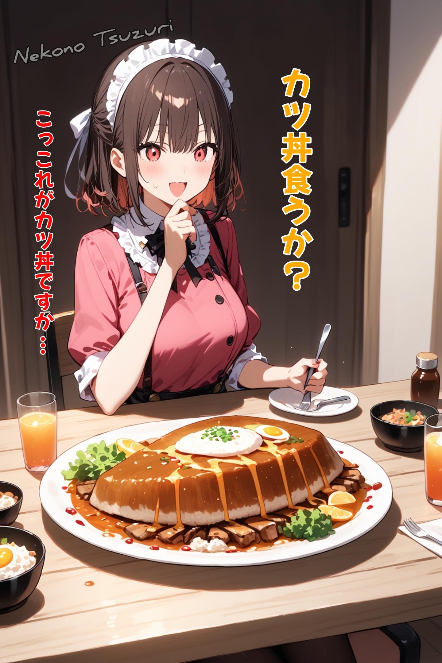 昼食時にカツ丼食べたくなるのではないかなと思って生成し、カツ丼を昼食か夕食に食べようというきっかけになったら、にしし計画通りと喜びますね。