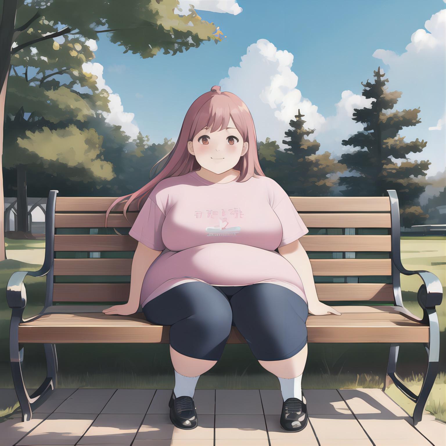 Tシャツを着て公園のベンチに座っているミケぽちゃ女子です!