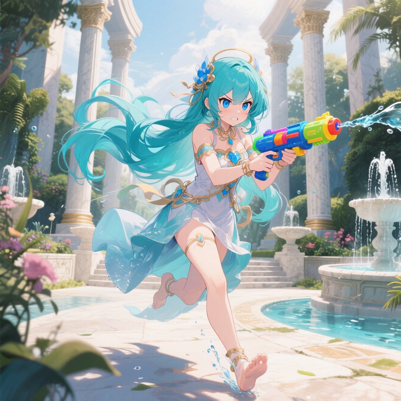 アグニは慌てて柱の陰から飛び出し、炎のオーラを纏って逃げる。庭はたちまち、水しぶきと炎の残光が交錯する戦場となった。