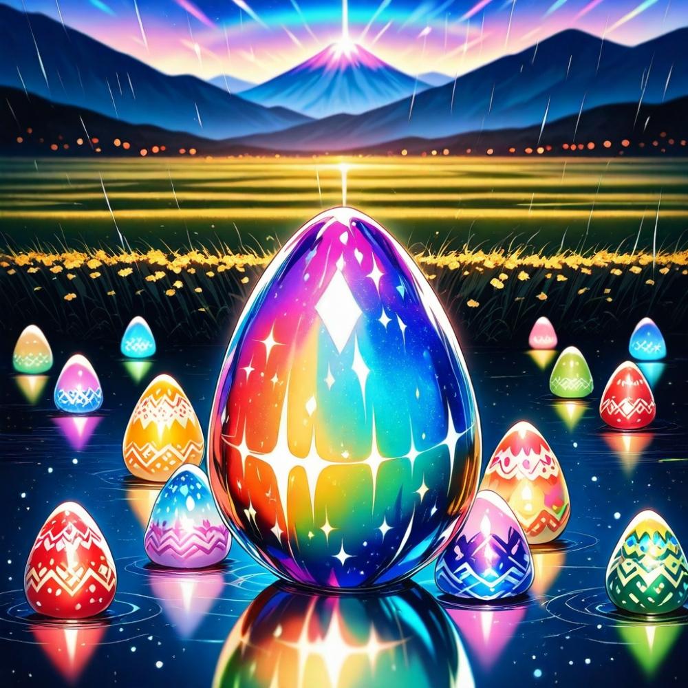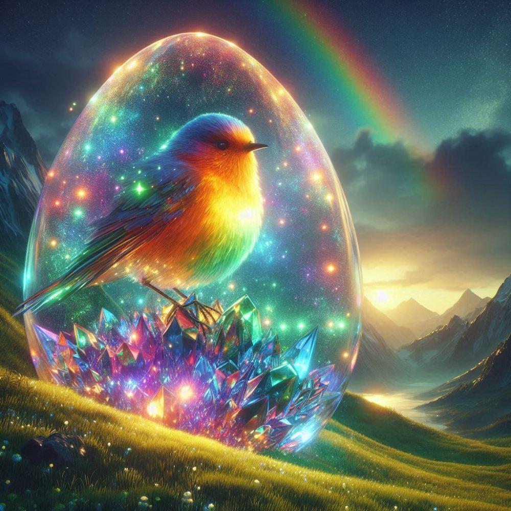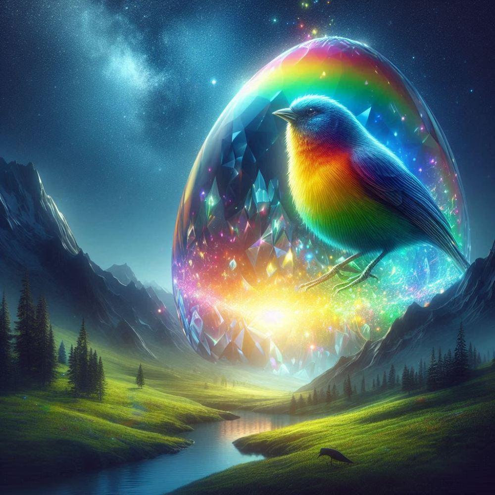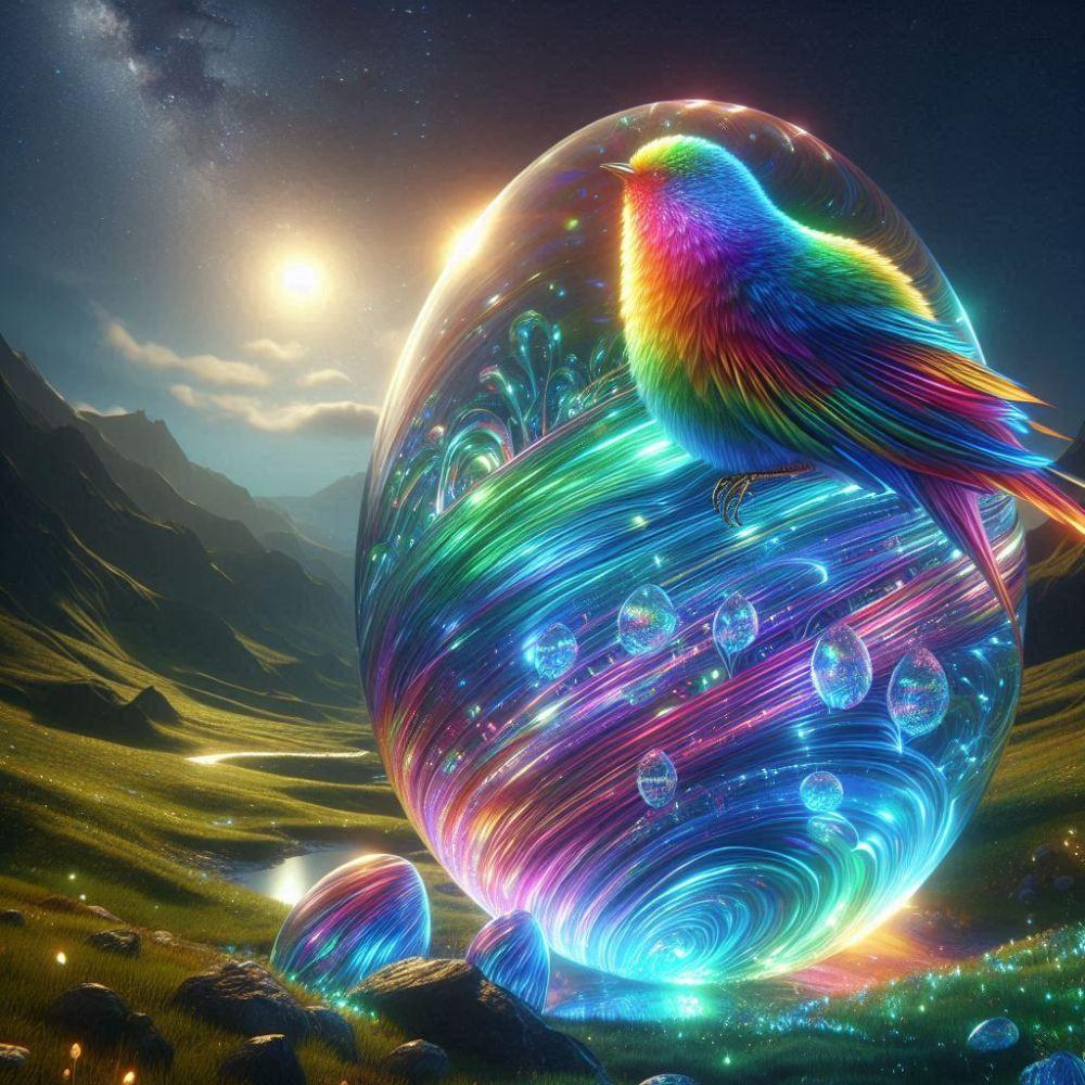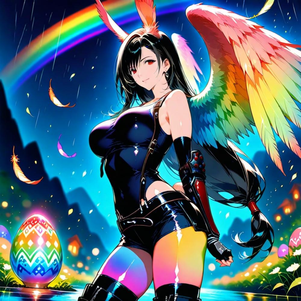 水彩風、梅雨の虹色発光鳥娘コスプレ人妻&虹色発光たまご